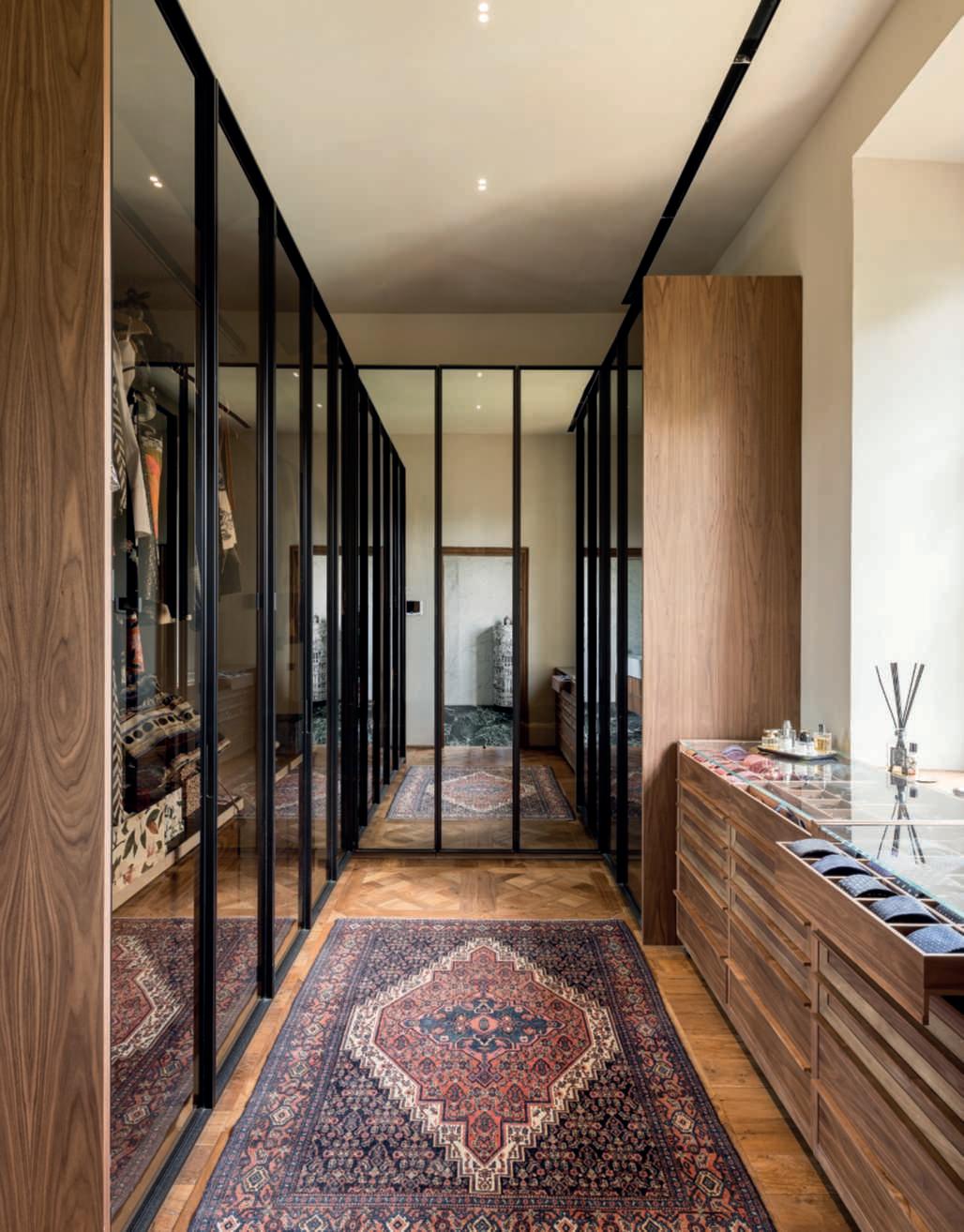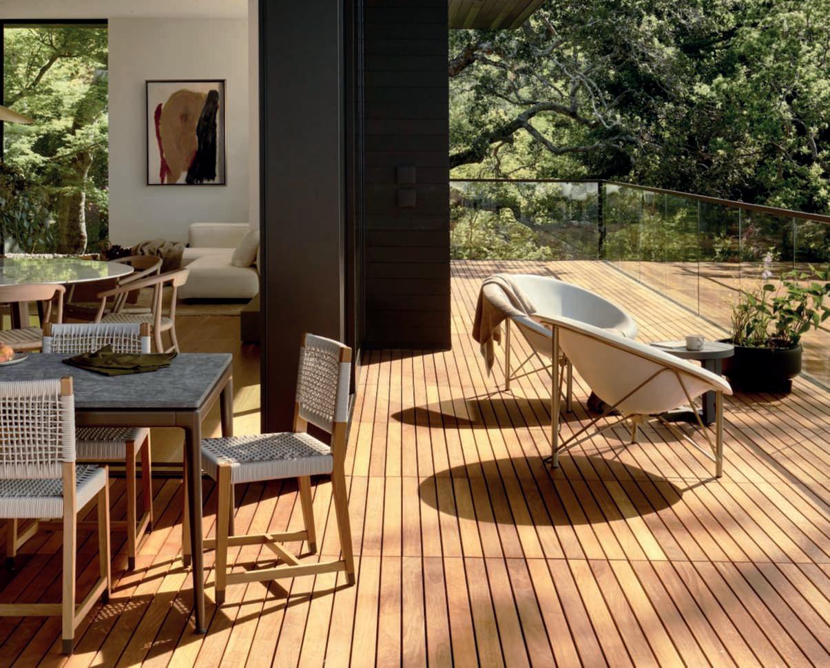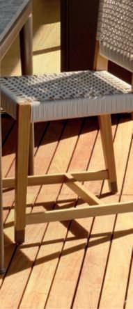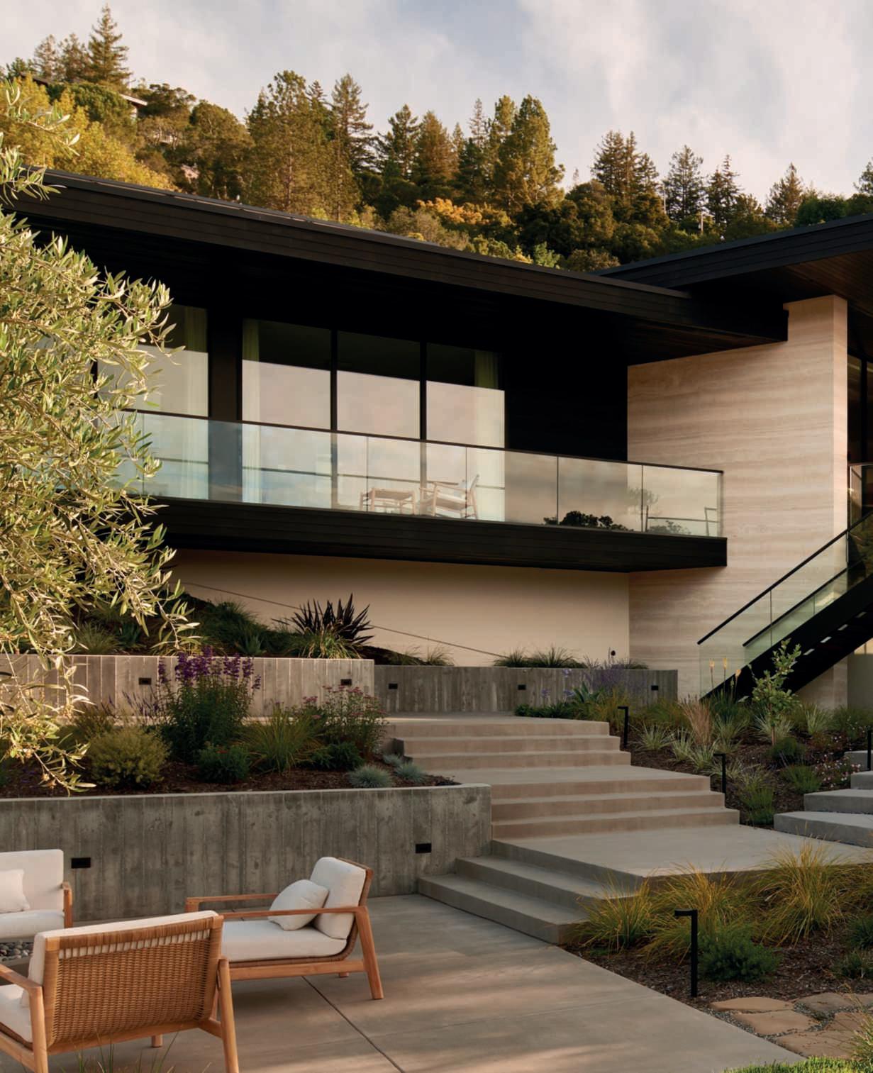 Onthispage,moreviewsofthe gardenwhere low walls built withpebblesharvestedalong t e a inal i er defne spaces withoutimpedingthe viewsofthelandscapeand becomea decorativeelement Senescentoaktrees alternate withmature Neltuma glandulosa var. glandulosa, young Parkinsonia x ‘Desert Museum’,Agaveamericana, and Dasylirion wheeleri. On the left page, near the mainresidence an intimate relaxation area with classic Adirondack chairs and a fre it