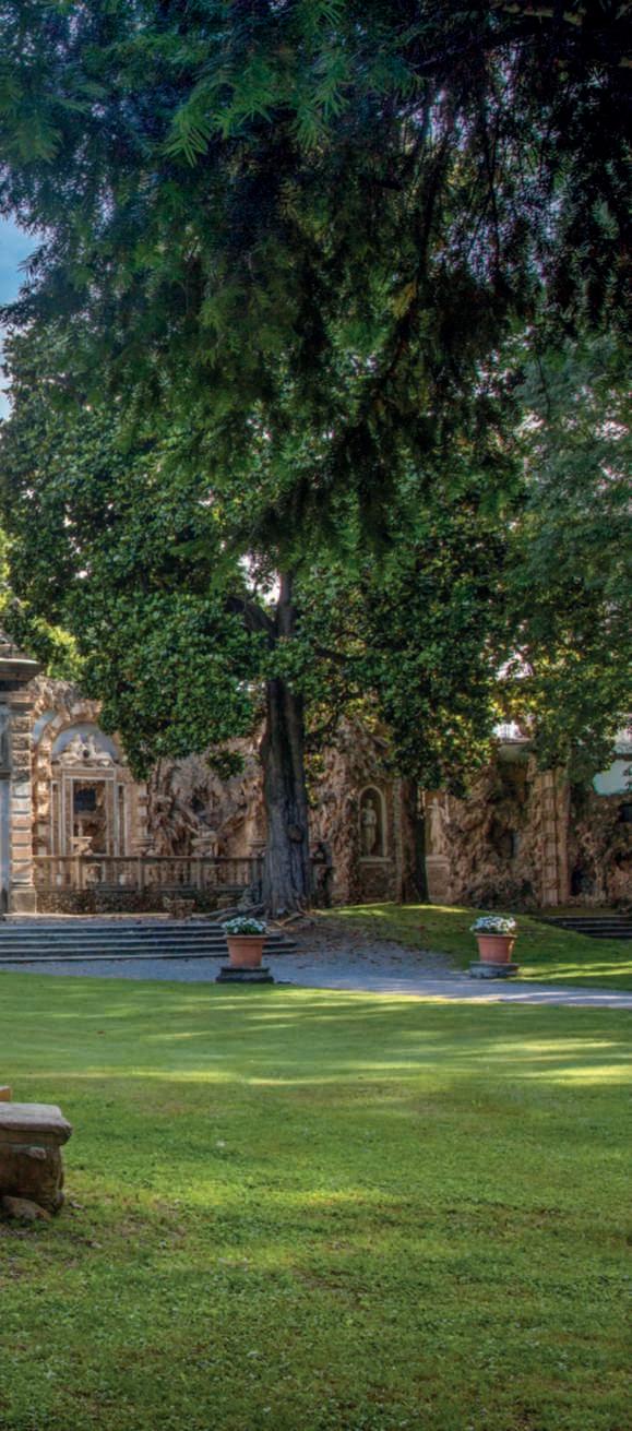 In queste pagine, una vista del frontesud edel Pronao del NinfeodiVillaVisconti BorromeoLitta, con le balaustre in pietra e il portico, edella Torredell’Acqua Nelle pagine precedenti,un particolaredell’emiciclodelle GrotteVecchie