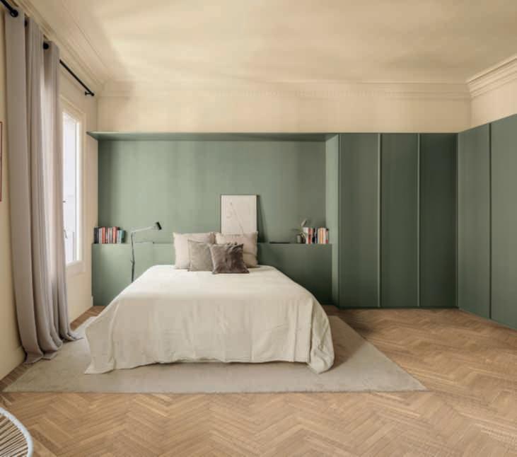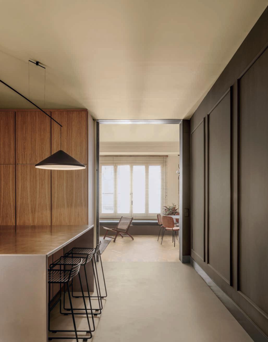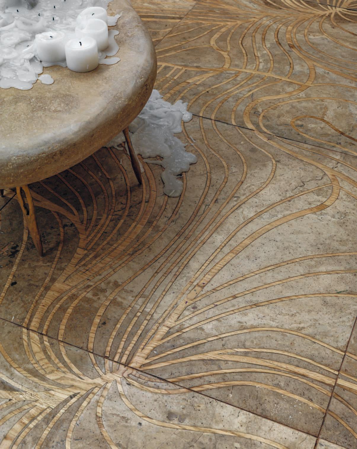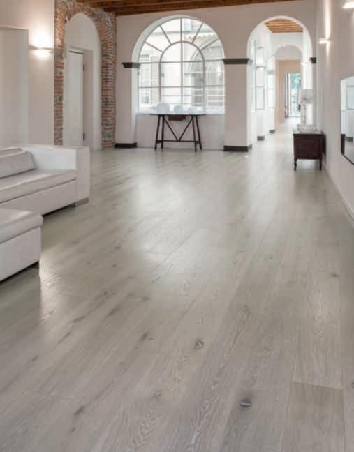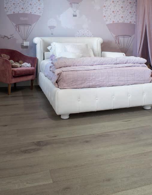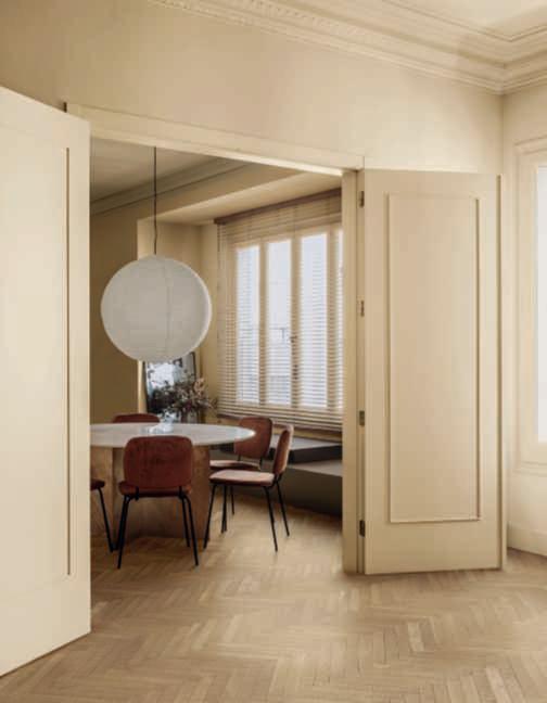 Hereontheleft, parquet and wallcoveringOlmoDe Casera brushedin RosaBianca finish.