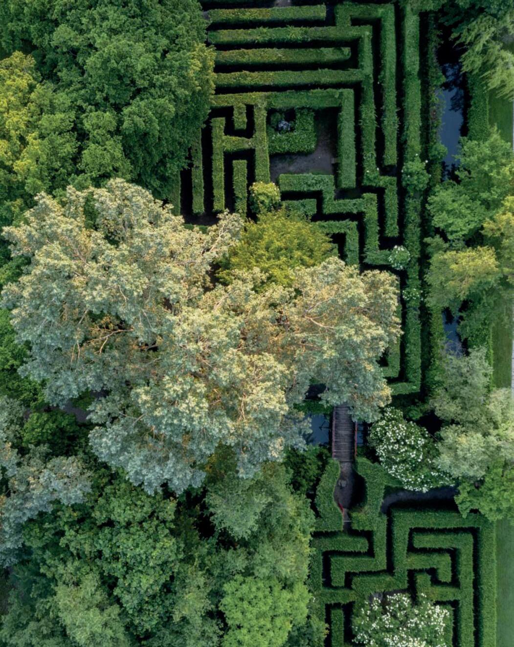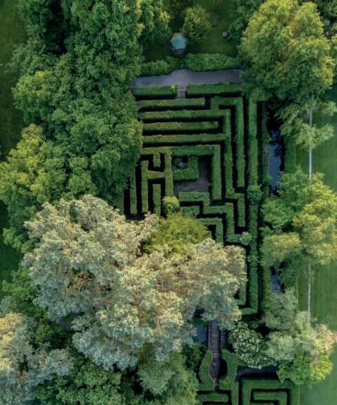 On this page,the two connectedlabyrinths:above, the maze,andbelow,the ‘Forsechesìforsecheno’ labyrinth,payinghomageto GabrieleD’Annunzio. On the leftpage,above,an ovalbasin inthesecretgarden,originally filled with thermal watersfrom thearea;inthecenter,abed with English Roses;below,a close-upofthe water lily pond atthecenterofthe formal garden.