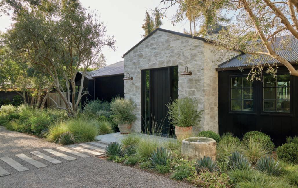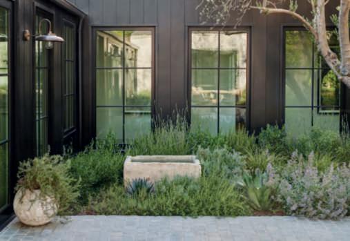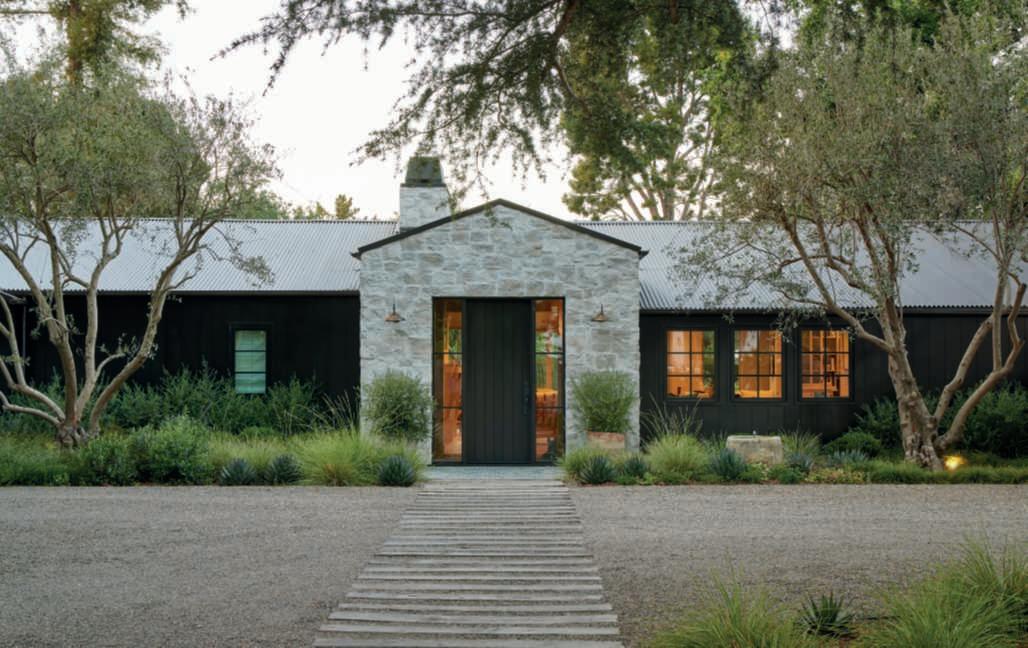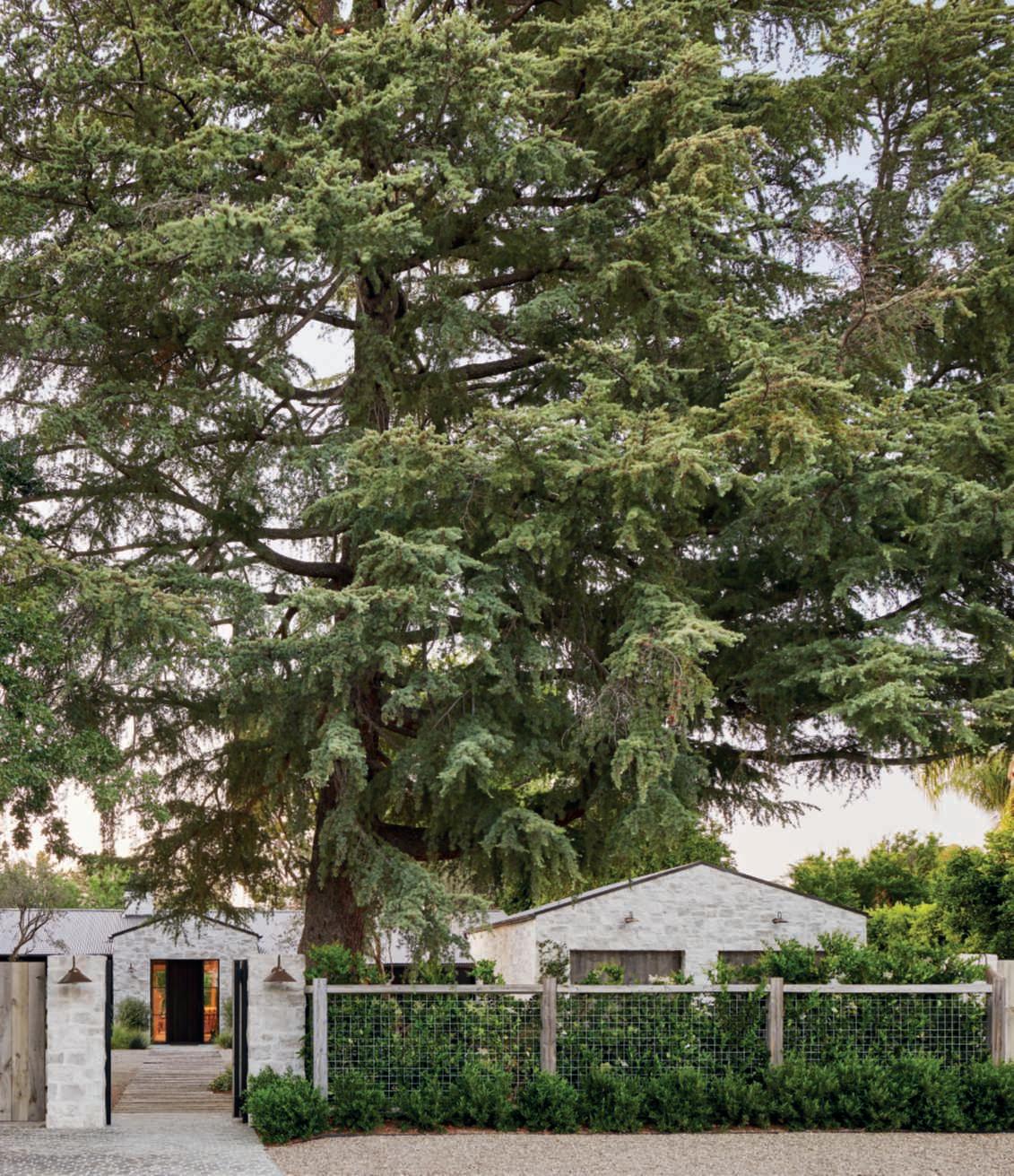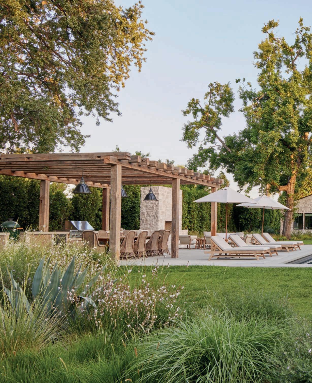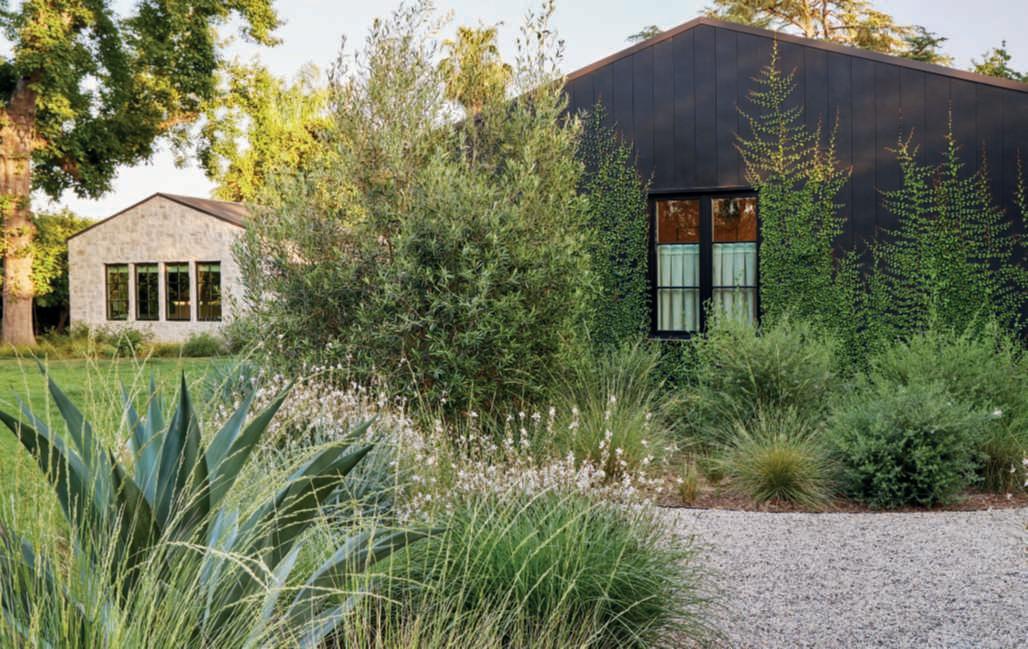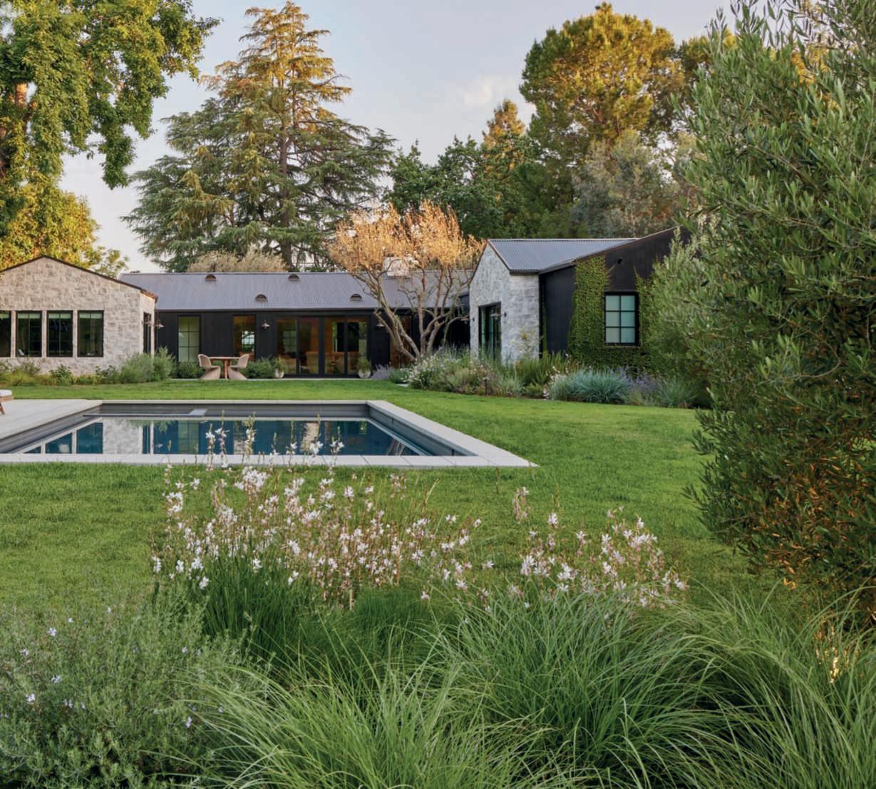 Theheartofthebackgardenisdedicatedtorelaxationandentertainment: here,thereisalargepoolwithanbuiltinspa,asunterrace,areclaimedwood pergolahousinganalfrescodiningandkitchenarea,inperfectAmerican style,andanoutdoorfireplacecladinthesamestoneasthehouse.Thelatter cozyspaceisidealforloungingwithfriendswhentheeveningsgetcooler.Of course,beingthehomeofaninteriordesigner,nothingislefttochance,and thefurnishingshavebeencarefullydesignedtointegratewiththeaesthetics ofthehouseandgarden.Theareaissurroundedbyawidelawn,essential tocounteractthevaryingheightsoftheplantsarrangedaround,especially thelargeoaksandolives,strategicallyplaced,andtoenjoywalkingbarefoot orplaying.Accessisviagravelpathwaysthatstartfromtheboundarysides ofthepropertyandwind,flankedbyinformalbedsandborders,towards otherareasfollowingasinuousdesignasacounterpointtothegeometryof thehouse,pool,andpavedareas.Theplantshavevaryingheightstoensure privacyanddynamismtothewhole,whoseskilfullyorchestratedplantingdesignoutlinescompositionswithdifferenttextures,shapesandhabits,staying truetothecolourpaletteofthebordersclosetothehouse,inaharmonious interplayofreferences.Gutierrezhascultivatedaplantcommunitybasedon thespecificneedsoftheplants,encompassingbothnativespeciesandthose originatingfromregionsexperiencingaclimateakintoSouthernCalifornia, chosenonthebasisoftheirsuitabilitytotheclimate,sitecharacteristics,and the way aplant works with the other ones within the garden. Ifalongtheboundariesglimpsesofhedges,composedofFicusmicrocarpa andsomePrunusilicifolia,todiscreetlydeterpryingeyescanbecaught,just abitfurther,thereisaprofusionofEchiumcandicans,Vitexagnus-castus,