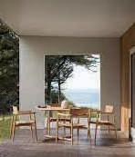 Sedie e tavolo della collezione EmbraceOutdoor realizzatiinteak non trattato. Design EOOS.