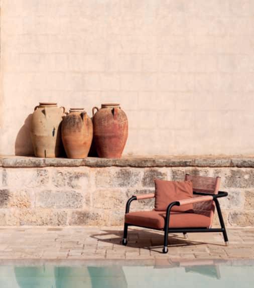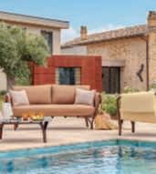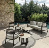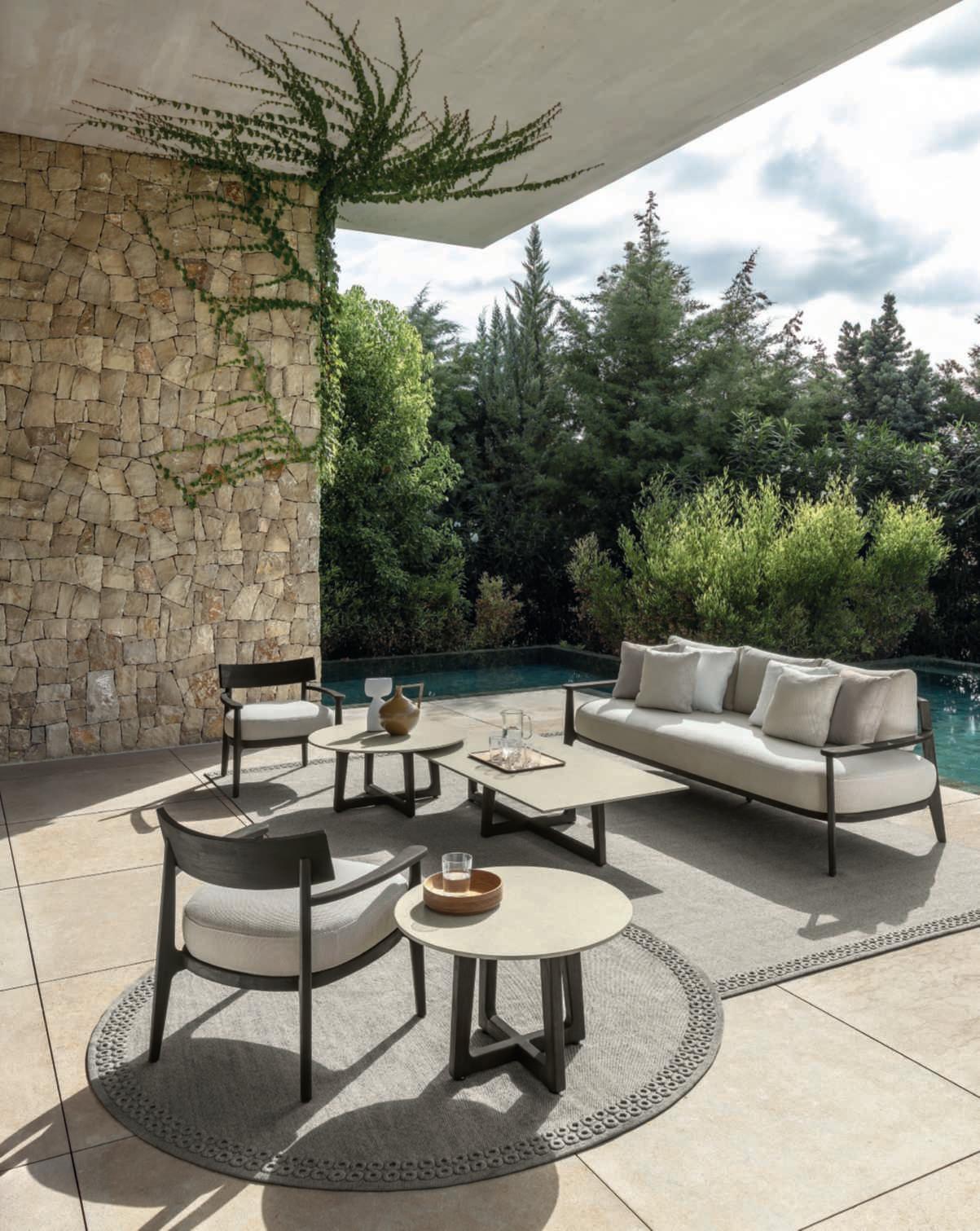 DesignedbyChristophePillet, Ever isacollectionofseating, furnitureandaccessoriesin which wood and lava stone cometogethertocreatea modernyetclassicallyinspired concept.Acompleteproposal, idealforcreatingopen-air livinganddiningareasthat,as thenamesuggests,isdesigned todefytime.This is due to a fluid and essential line,soft cushionsandacolorpalette orientedtowardneutralshades andnaturalhues,abletoadapt toanyoutdoorcontext.
