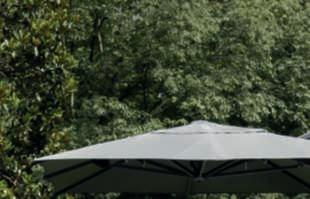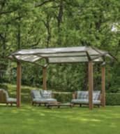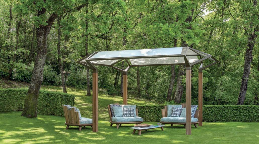 Pergola Cosmo firmataStudioAMDL CIRCLE.Lastruttura è definita da colonne inteakspazzolatocon‘rami’realizzatiin fusionedialluminiochesostengonoil teloombreggiante in tessuto. Nella foto, il prodotto è abbinato a poltrone della collezione Rafael, design Paola Navone.