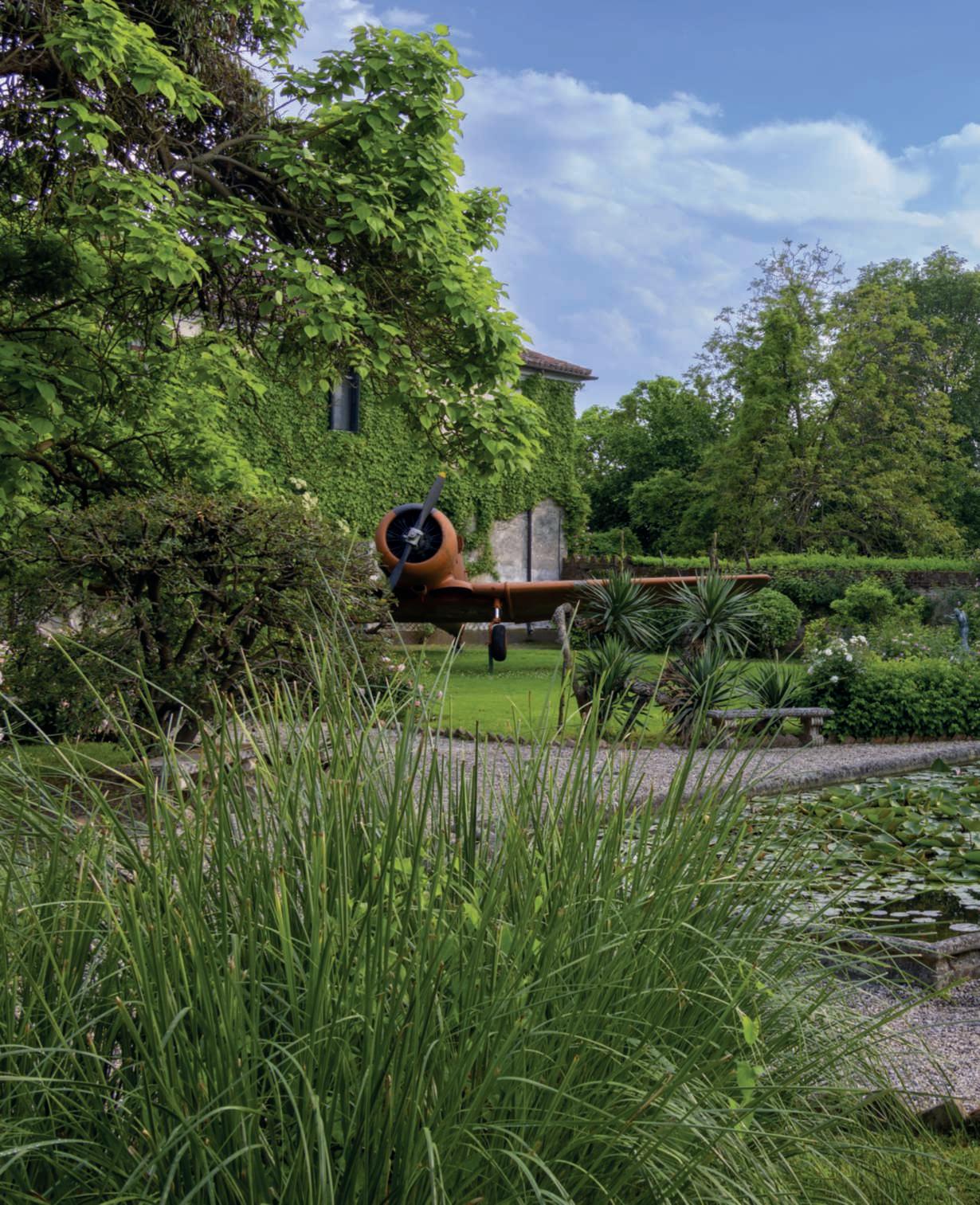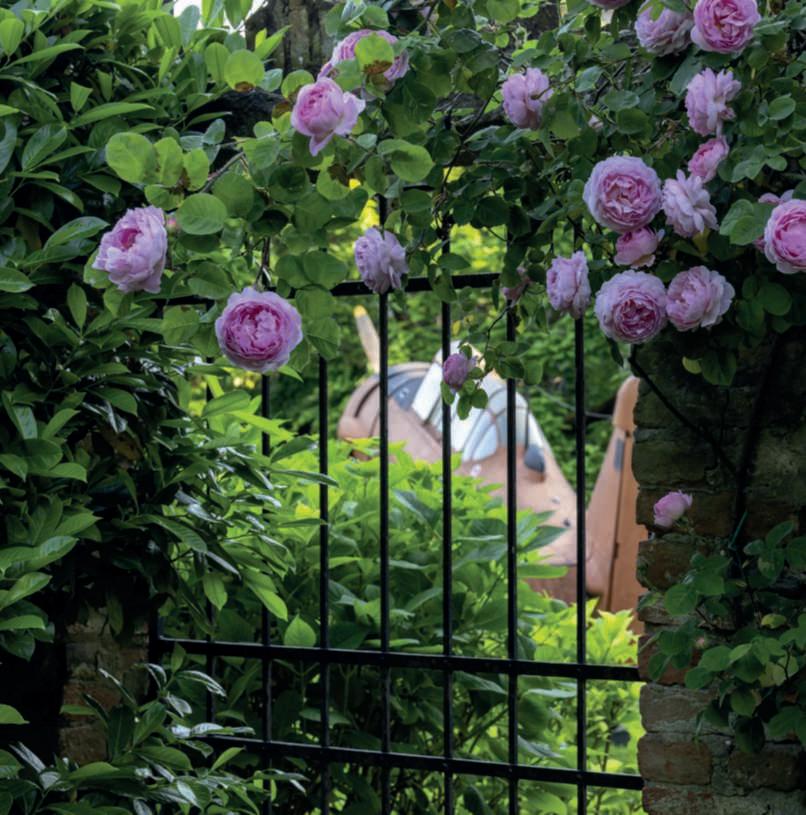 Onthispage, Rosa‘ConstanceSpry’ climbingona gate,withtheNorthAmerican T-6Texaninthebackground. Ontheleftpage,above,the fishpond,alongwhosebanks rosesclimbonspecific structures,replacingthe walls;inthewater,theyellow flowers of Nupharlutea are noticeable.Below,adetailofa groupof EnglishRoses, hybridisedbyDavidAustin, thatare known for the beauty oftheircorollasandparticularlyintensefragrances,witha Yuccagloriosa inthe background.