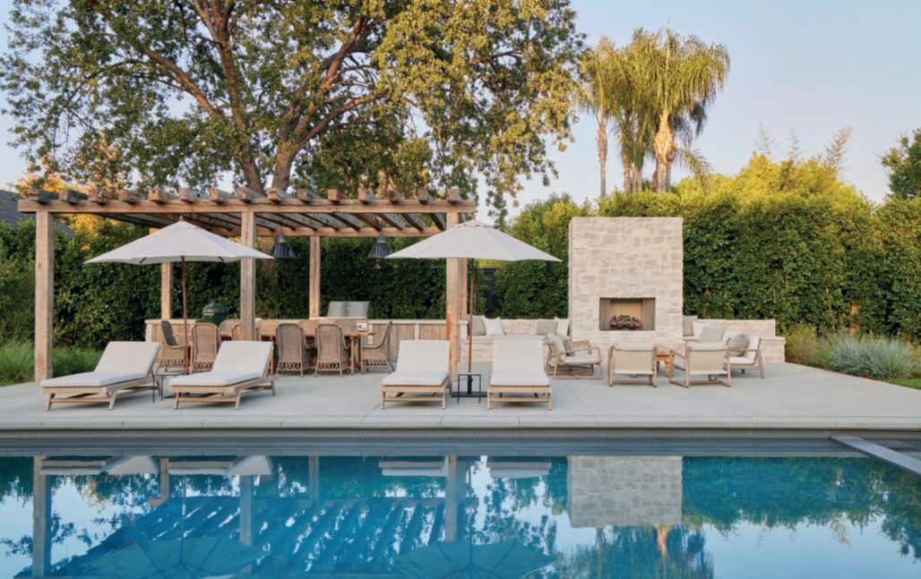 Inquestapagina,inalto,le areediintrattenimentoconla piscina,il solarium,la pergola eil camino;inbasso,unavista dellapergoladovesitrovano una zonapranzoecucina all’aperto con barbecue