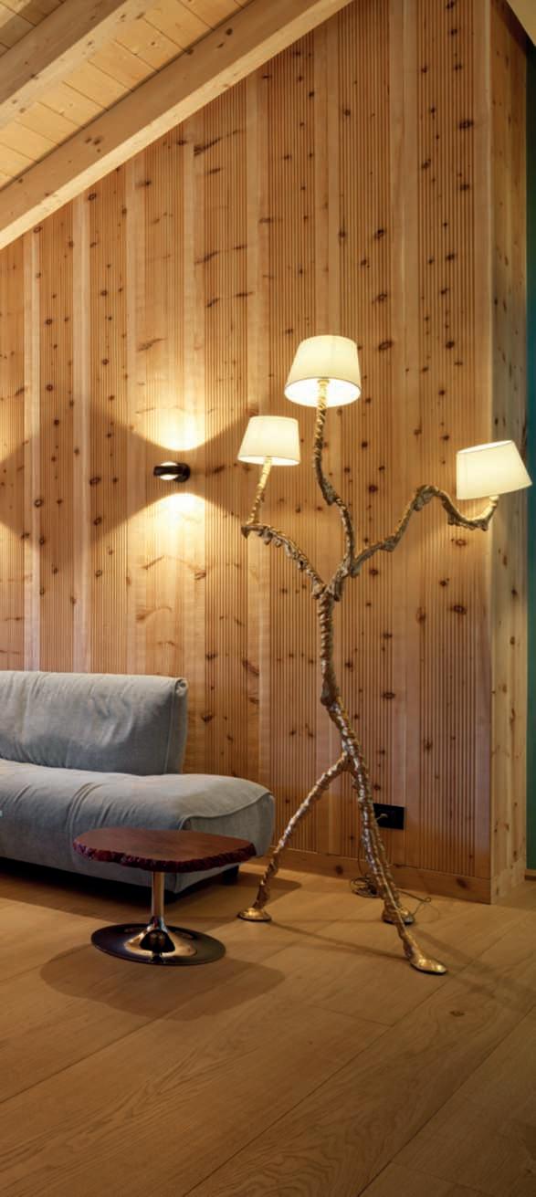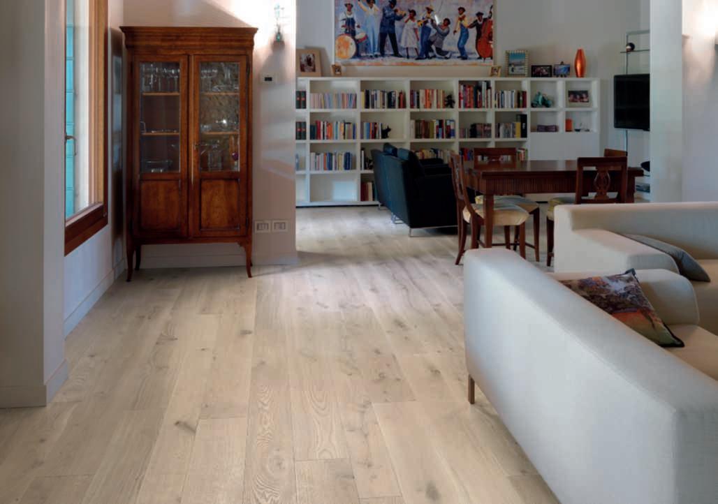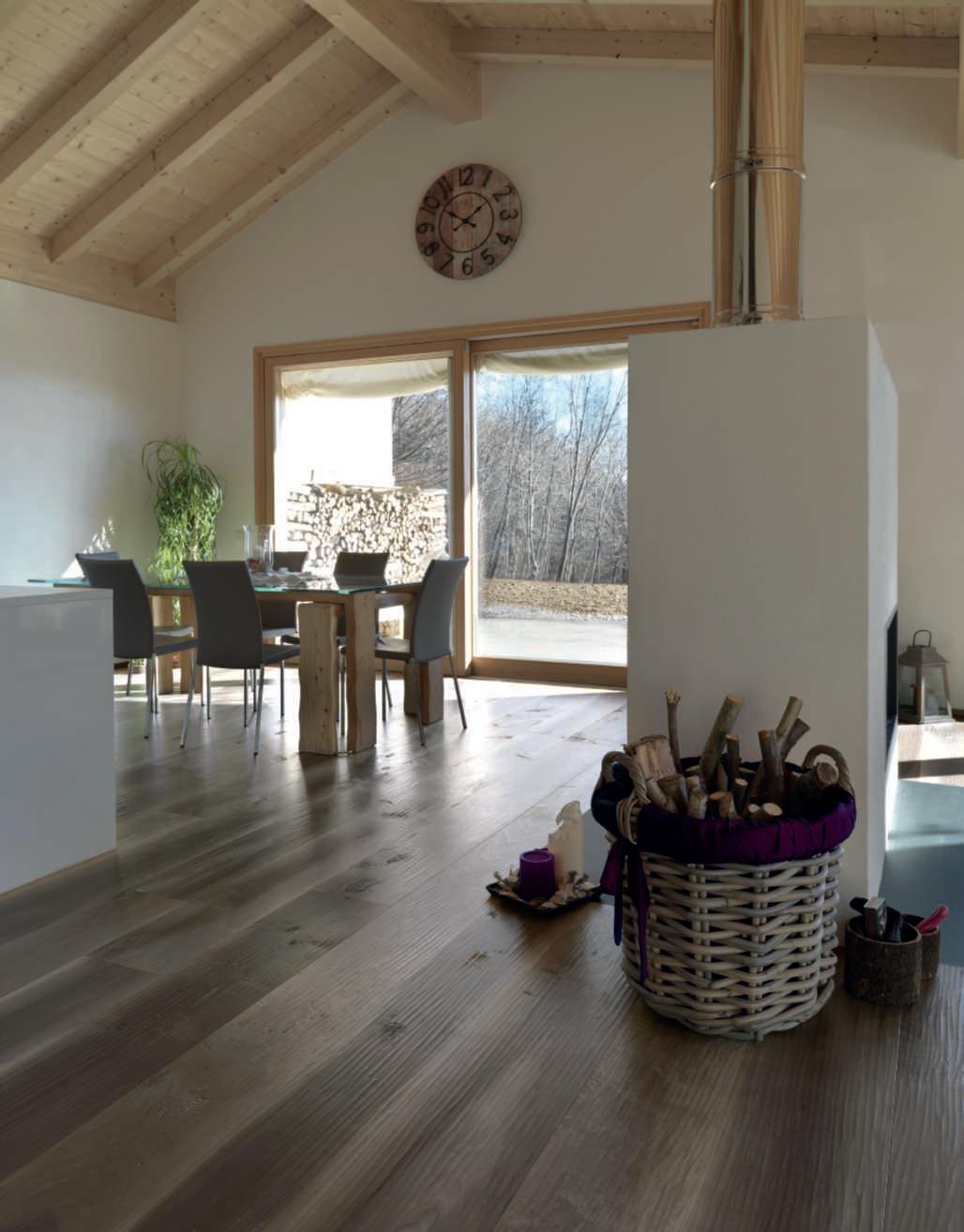 In queste pagine e nelle seguenti, alcune realizzazioni conprodotti Cadorin a contrassegnoNatur. Qui a sinistra, parquet e rivestimentoapareteOlmoDeCasera spazzolato nella finitura Rosa Bianca