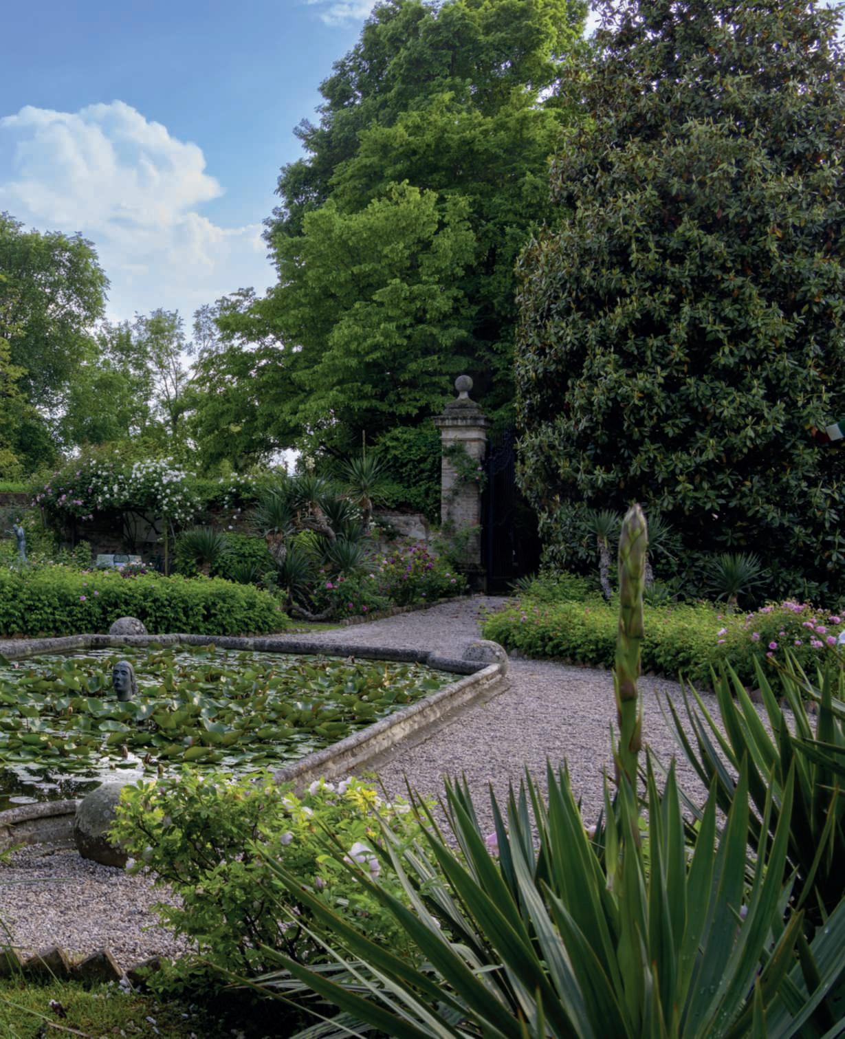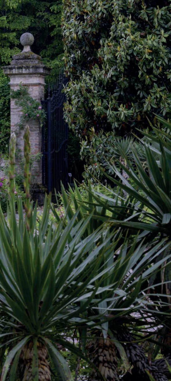 circatreettari,articolatoinunaseriedigiardinicheconfluiscono unodentrol’altro,cuisiaggiungeunosegretoeappartato.Ilpiù notoèilgiardinodirappresentanza,odellerose,conlaclassica spartimentazioneinquattroaiuoleconalcentrounavascarettangolare,nellaqualeinestateleninfeeapronolelorocorolleebrillanoal sole.Intornoallavasca,profumate Rosarugosa su tre lati e deliziose Paeoniasuffruticosa ‘HanaKisoi’dallegrandicorollerosaperlato sulquartodelimitanoleaiuole.Unabellacollezionedirose,passionedellaproprietaria,anticheemoderne,scelteperilprofumo,la graziadeifiori,ilportamentoelefoglie,elementospessotrascurato madinonsecondariaimportanza,èospitataall’internodiaiuole, suimuridelcastelloesuquellidicinta.Grazieaunaselezioneaccurata,daprimaveraall’autunnononc’èmomentoprivodifioriture. Una Clematisarmandii si arrampica su una Catalpabignonioides di inizio900,precedendone,inaprile,coisuoifioricandidieprofumatissimi,lafioritura,sottolosguardovigilediungrandecipresso.Questialberisonobilanciatiotticamentenell’aiuolaoppostada grandi Magnoliagrandiflora ‘Galissonnière’ il cui profumo dei fiori permeal’ariaainizioestate.Uncancelloimmettenell’ombrosoviale dicarpini,conesemplariamaturitàosenescenti,dagliaffascinanti