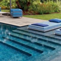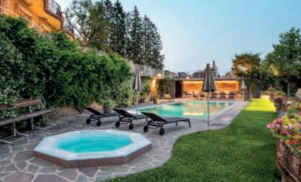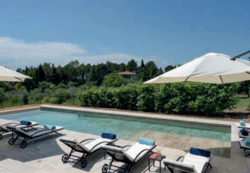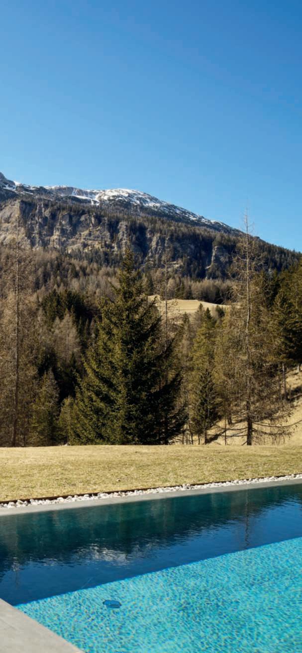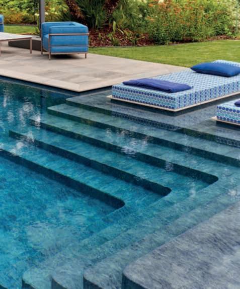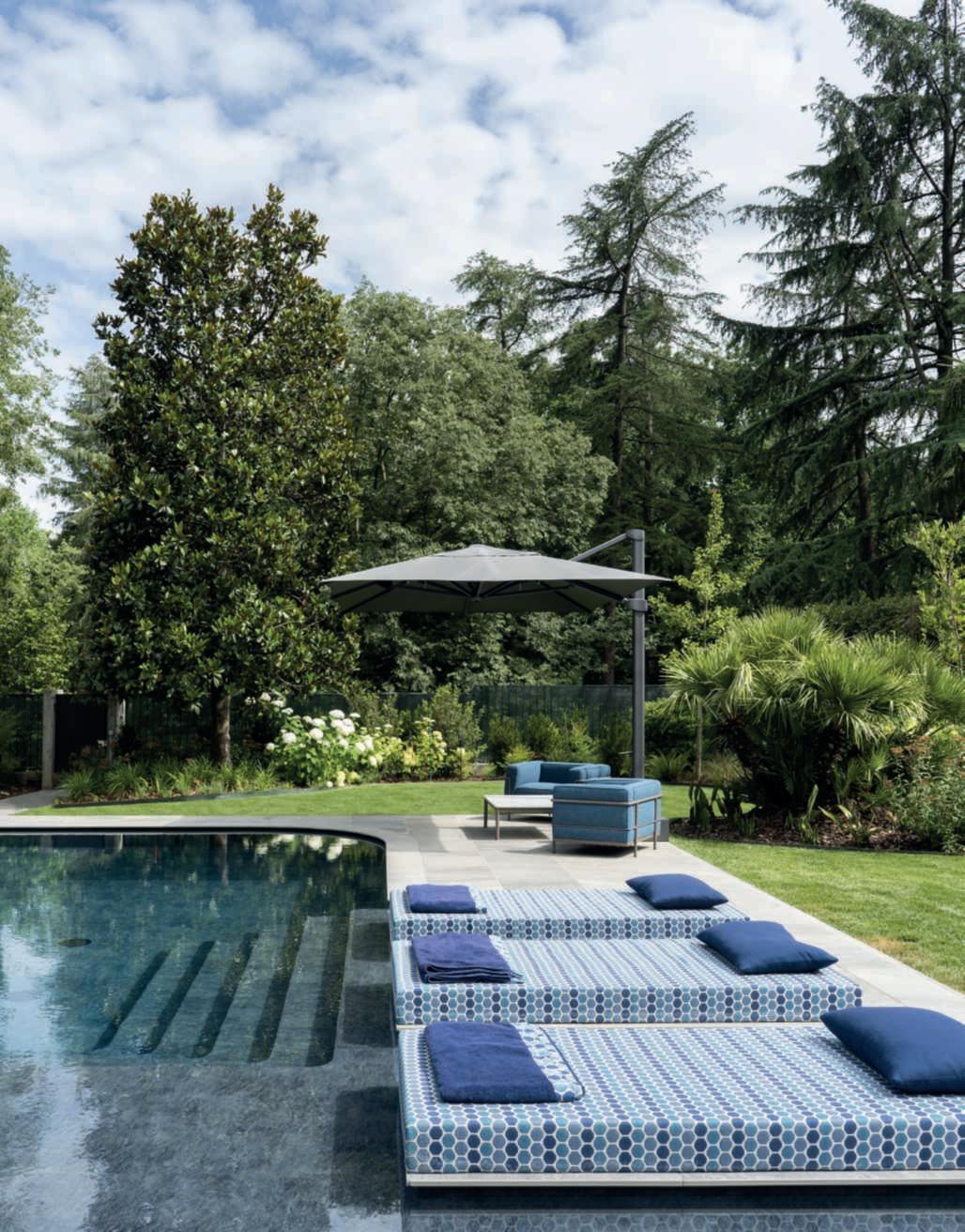 Su unlatodellapiscina,lungacirca15metri,èstataricavataunacorsiaaprofonditàcontinuapensataperilnuoto,mentrelaparterestanteètuttadedicata alrelax.Sonostaticosìrealizzatiunascalinatasott’acquacheportagradualmentelavascaaunaprofonditàdi180cmedeibasamentiperilposizionamentodimaterassiasfiororivestiticontessutiimpermeabilipersonalizzati conunmotivodecorativodiPaoloFrelloconcoloriestiviedisegnigeometrici ispiratiaglianni70.Acompletarequesta‘spiaggetta’,lepoltroneoutdoorLC3 diCassinasudisegnoLeCorbusierelapavimentazioneinlastredipietraquarzite.LapartetecnicadellapiscinaèstatacuratadaPiscineCastiglioni. l T.M.