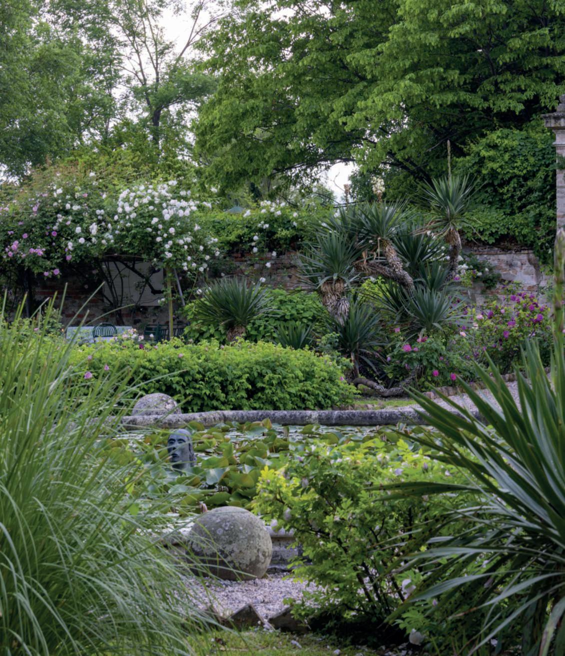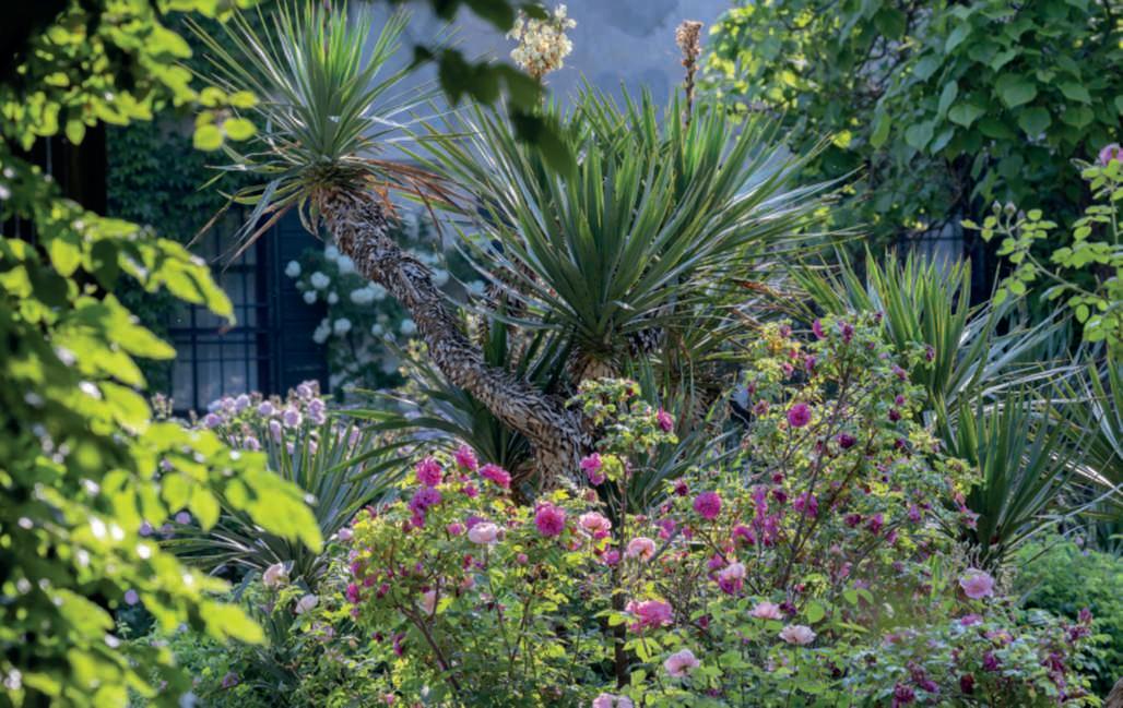 On the preceding pages, a view of the formal garden with the water lily pond and, from the left, Catalpa bignonioides,groupsof roses, Yucca gloriosa and Magnolia grandiflora ‘Galissonnière’; on thelawn, a NorthAmericanT-6Texan, an advanced training aircraft from the 1930s. On this page, a close-up of the same garden, featuring shrub andclimbing rosesinshadesrangingfrom pearly white to intense pink