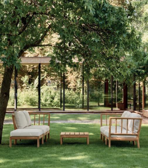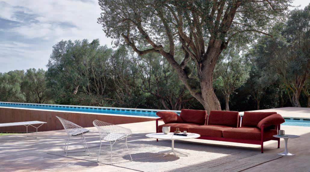 Lissoni OutdoorCollection reinterpreta in chiave contemporanea i mobili da giardino disegnati da Richard Schultz nel 1966. La proposta comprende divani, poltrone, pouf e tavolini. Nella foto, il divano a tre posti e sulla sinistra, poltrone Bertoia Collection for Outdoor.