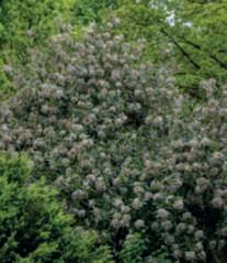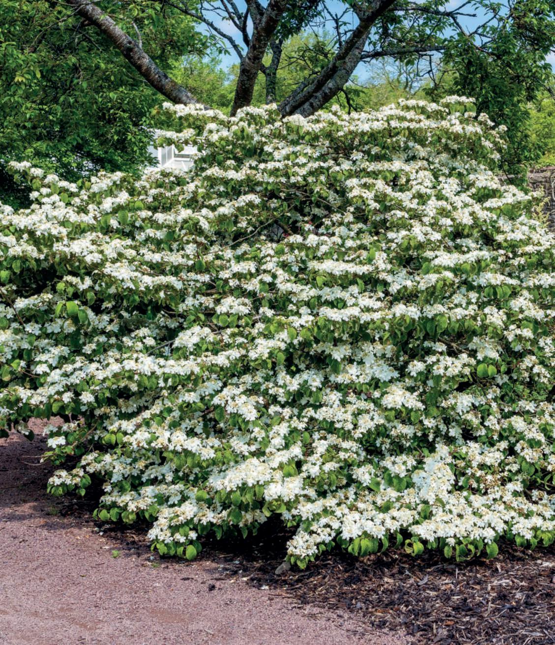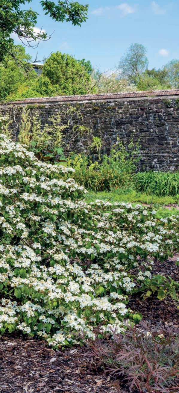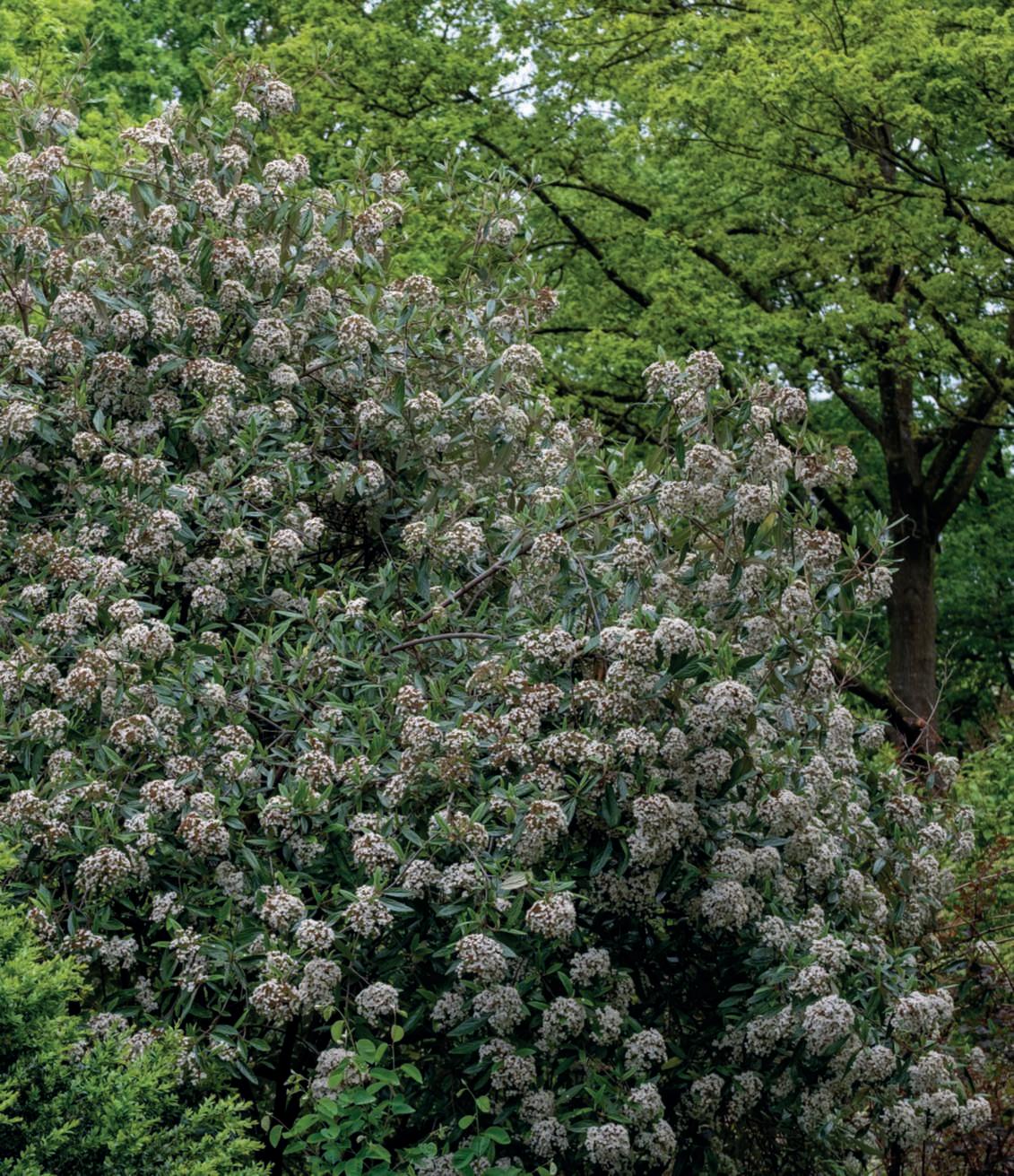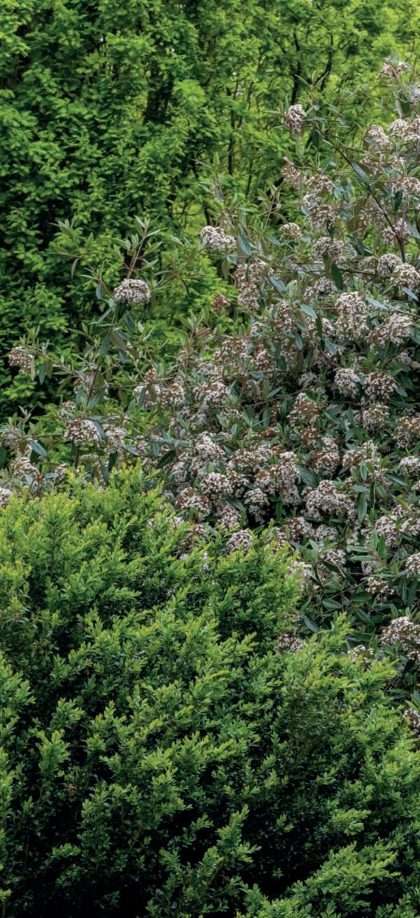 Indeed,inthisgenus,majesticshrubslikeViburnumplicatumare notlacking.Availableinnumerouscultivars,theyboastaspreadinghabitwithbranchesthatgentlyarch,adornedinMaywith magnificent,flatinflorescencesinpurewhite,ivory,oroccasionally tingedwithpink,resemblinglaceor,morerarely,takingonround shapes.Thesamespeciesalsoofferscultivarswithamoreupright andpyramidalhabit.Dimensionsquitecontainedinheightanda compact,roundedhabitareinsteadfoundintheevergreenV.davidii,withitssplendiddarkgreenandglossyleaves,crossedbysymmetricveinsthatprovideelegance,accompaniedbymagnificent black-blue berries. Indeed, there is a graceful charm in the habit of someV.opulus,whosebranchesbendundertheweightofdelicate whiteglobularblooms,andinV.carlesii,shorterinheight,with rounded,spreadingform.Inearlyspring,itfillswithintenselypink floral buds that unfold into white and fragrant flowers. NoteworthyisthemagnificentViburnumbodnantense'Dawn', withitsgracefulwinterfloweringinpinkonbarebranches,which isbothabundantandintenselyfragrant.EquallydeservingofmentionisV.farreri,whichblooms,perfumingtheair,fromNovember andcontinuesuntilMarch.AspecialmentiongoestoV.sargentii'Onondaga,'whosedistinctiveleavessuffusedwithbrownand becomingredinautumn,flatinflorescencesfeaturinglargesterile flowersontheoutsideandfertilefloretsontheinside,openingfrom darkredbudswhilemaintainingapinkishhue,makeitanunforgettablespectacle.Theviburnumgenustrulyoffersawealthof species,hybrids,andcultivars.Forthisreason,Villegiardiniasked VittorioConsonni,apartneratVivaiNordandconsideredtheItalianexpertonviburnums,torecommendaselectionofthemost beautiful and reliable ones. ■