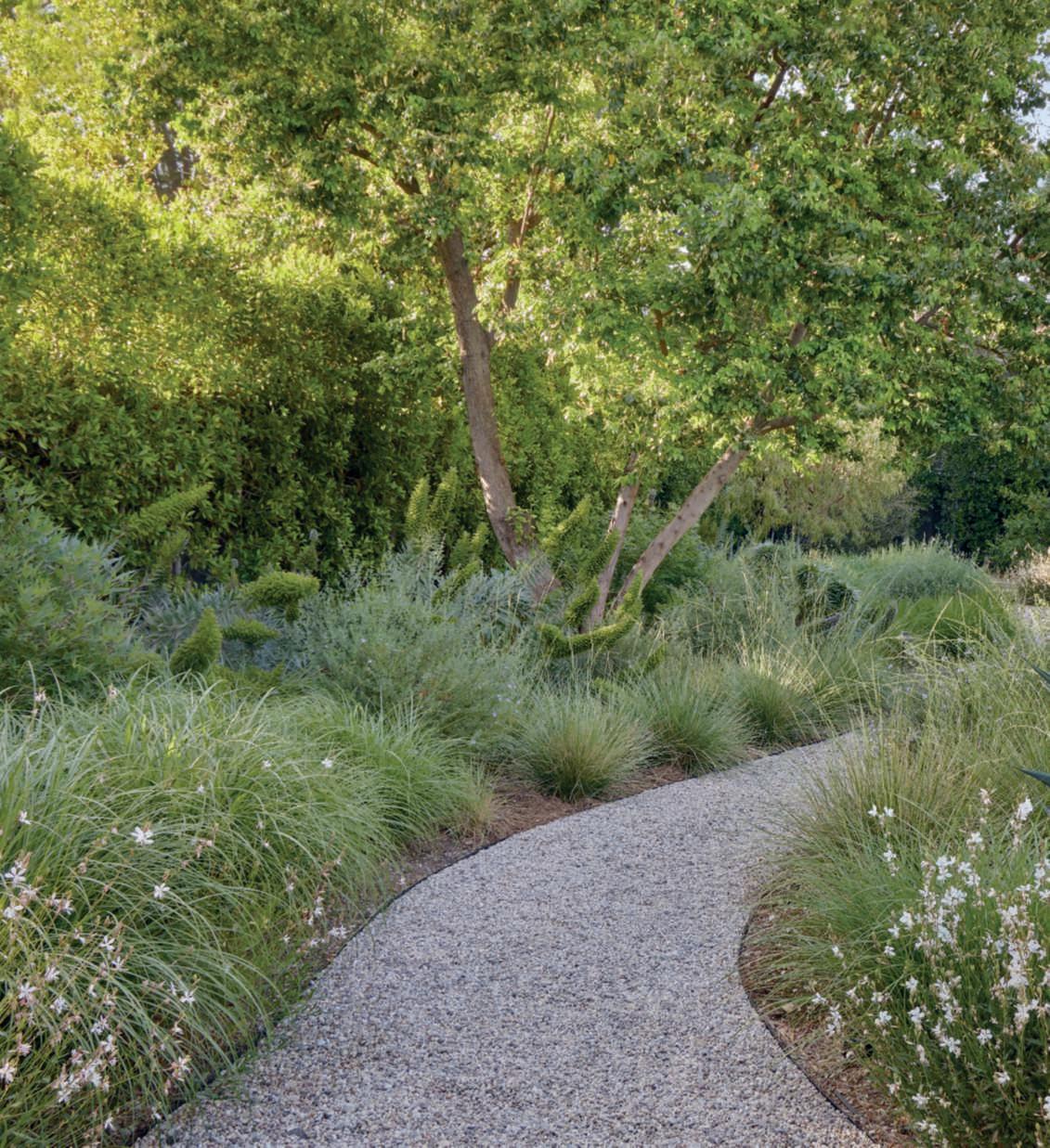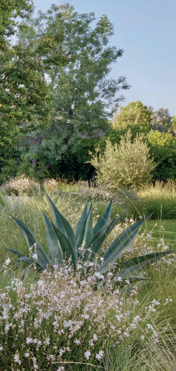 Inquestepagine,unavista del giardinoposteriore con inprimopianouna zona conversazione circondata principalmenteda Gaura lindheimeri ‘GeyserWhite’, Muhlenbergiarigens, Artemisiacalifornica, Miscanthus sinensis‘Adagio’.Sullosfondo, unamaestosa Quercuslobata Nellepagineprecedenti, viste delleaiuoleeborduredel giardinoposteriore,nelle qualisinotanoprincipalmente Agaveweberi, Muhlenbergia rigens, Gauralindheimeri ‘Whirling Butterflies’, G. l. ‘GeyserWhite’, Westringia ‘WynyabbieGem’, Leymus condensatus ‘CanyonPrince’, Nepeta x faassenii ‘Walker’s Low’, Miscanthussinensis ‘Adagio’, olivi, Ficuspumila e Sequoiasempervirens