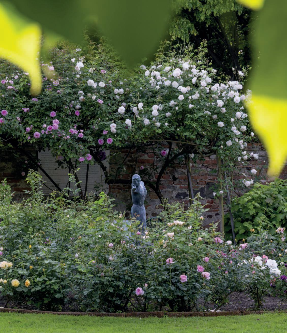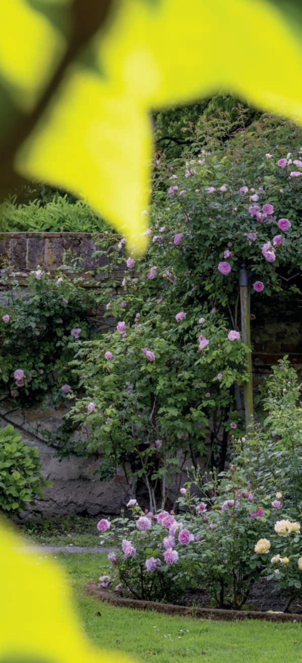 opensintotheshadedavenueofhornbeams,featuringmatureorsenescent specimenswithfascinatingtwistedtrunks,alongsideyoungerplants.The avenueculminateswiththemoundoftheIcehouse,butbeforereachingit, alongoneside,largeRosabanksiaeprecedealargeirregularlyshapedfishpondwithapeninsula.Recentlyadornedwitharomanticpergolaandfour berceauscoveredinwisteriawithgraduatingcolors,thepondenhancesits charm. Along the sides of the pond, roses climb on speciallydesigned structures,replacingthesurroundingwalls.Insidethepond,Nupharlutea,like smallyellowpearls,enliventhewaters.Ontheothersideofthehornbeam avenue,twolabyrinthsinxCupressocyparisleylandiiareconnectedbya footbridge.Thefirstone,relatedtothethemeofflight,Icarus,andthemyth oftheMinotaur,isamazewithwallsalmostthreemetershighfeaturing deadends;thesecondone,smallerandmorerecent,hasauniquepathleadingtoascatteredcenterofmirrorsandisdedicatedtoGabrieleD’Annunzio andthetitleofhisnovel‘Forsechesìforsecheno’(Perhapsyes,perhapsno), inspiredbyamottofoundinalabyrinthpaintedonaceilingoftheDucal PalaceofMantua.Beyondtheright-angledbuilding,facingtheCastle,lies thesecretgarden,almostaprivateoasis;itisanarboretumshowcasingone ofthefirstLagerstroemiaindicatbroughttoItalyinthelate18thcentury, anancientStyphnolobiumjaponicum‘Pendulum’shadinganovalbasin oncefilledwiththermalwatersfromthearea,variouslindentrees,and fourbedswithshrubs,roses,andaromaticherbs.Onthewalls,roses,one ofthegarden’sguidingelementsalongwithflight,wisterias,jasmine,and clematis. There is also an old boxwood, senescent and somewhat worn, not stressedbyexcessivecareorfelled:atSanPelagio,theownerhaschosennot to replace nature but to respect it and enjoy the beauty it gives her. ■