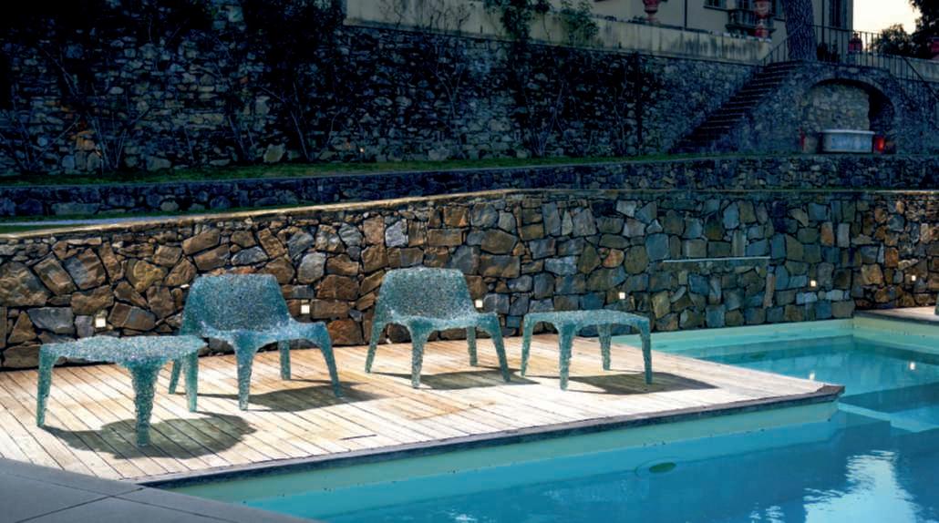 Armchairsandlowtablefrom Veronica collectionbyJacopoFoggini.Eachmodel ismadefromasingleweaveofpolycarbonate,hand-shapedinthegreencolor of naturalglass.Anexclusive processing thatgivesthefurnituretransparenciesand shadesofcolorsalmostimperceptible.