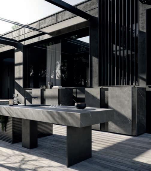 Cucina Project05 conIsolaBlockingranito NeroAssolutoefinitura Millerighe. Piano Mediterraneo in pietra Graphite Raw.