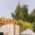 Cosmo shading pergola designed by StudioAMDLCIRCLE.The structure is defined by brushed teak columns with ‘branches’ made of cast aluminum that support the fabric shade cloth. In the photo, the product is paired with armchairs from the Rafael collection, design Paola Navone.
