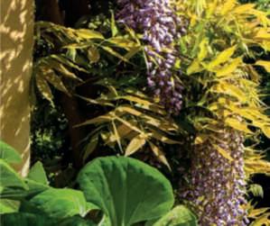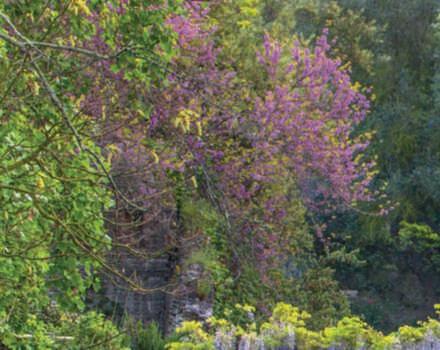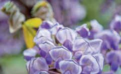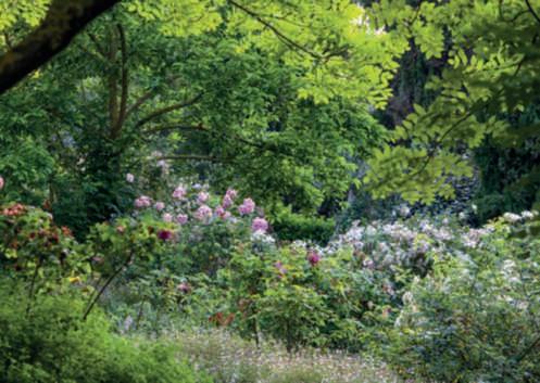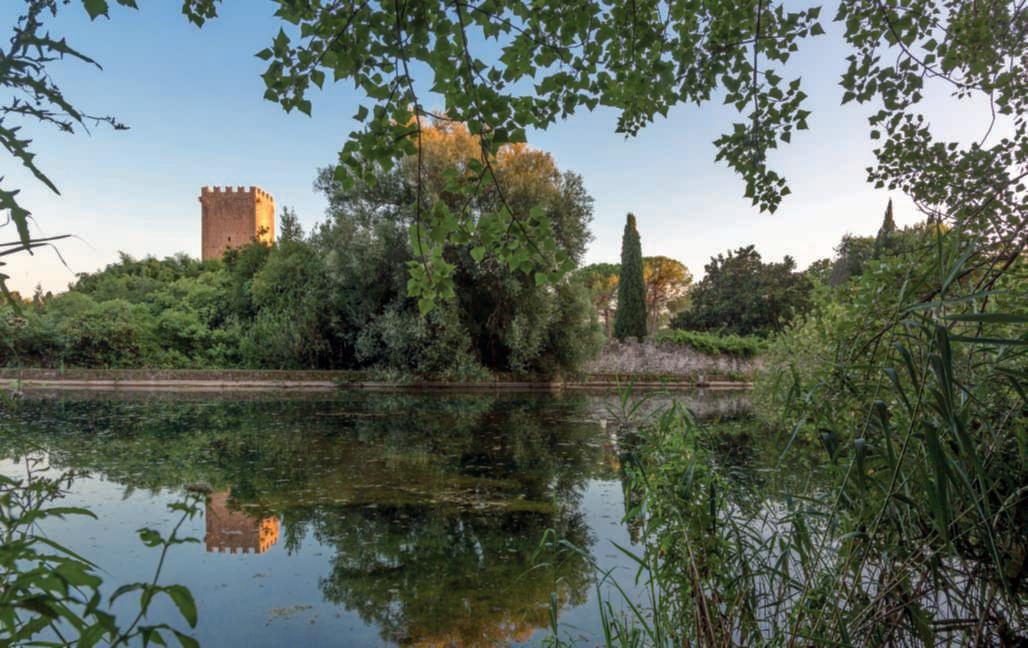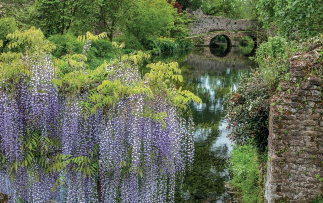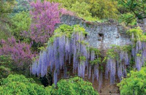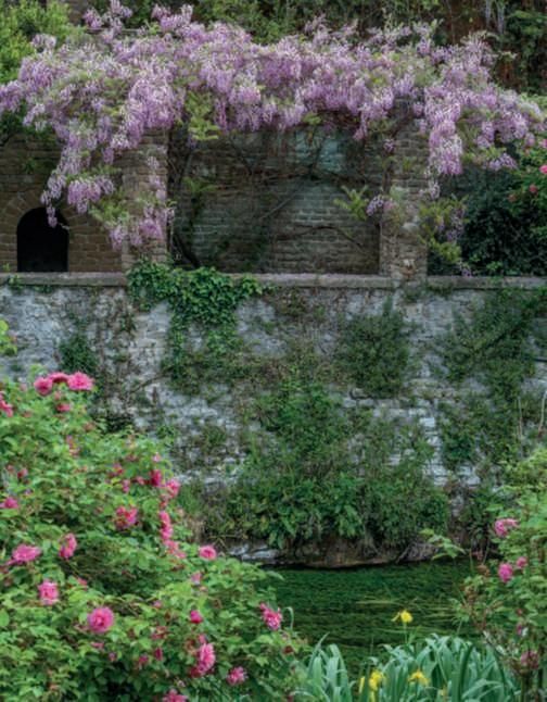 ricopertoda Wisteriafloribunda ‘Macrobotrys’,sullosfondo ilmuro di cinta dell’antica città medievale e inprimo piano Irispseudoacorus. Nellepagine precedenti, una vista intrisa di romanticismo del fiume Ninfa conil PonteRomano ricoperto da Wisteriafloribunda ‘Macrobotrys’, che sispecchia nelle acquee,sullosfondo, Cercis siliquastrum in fiore.