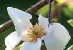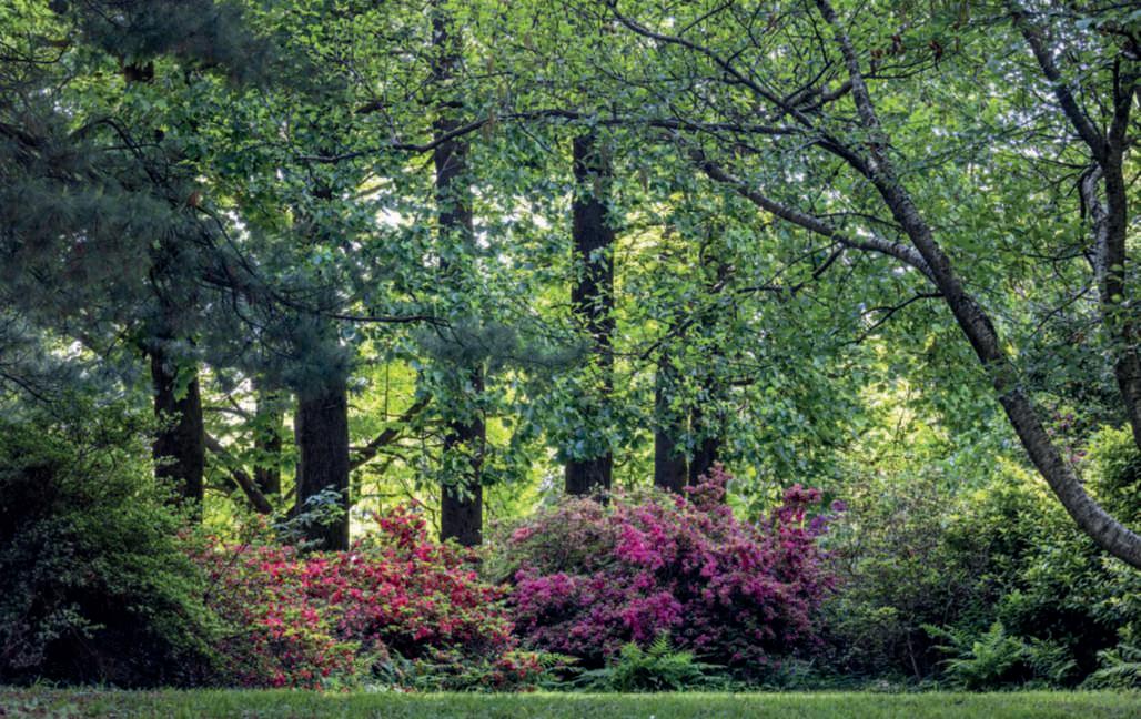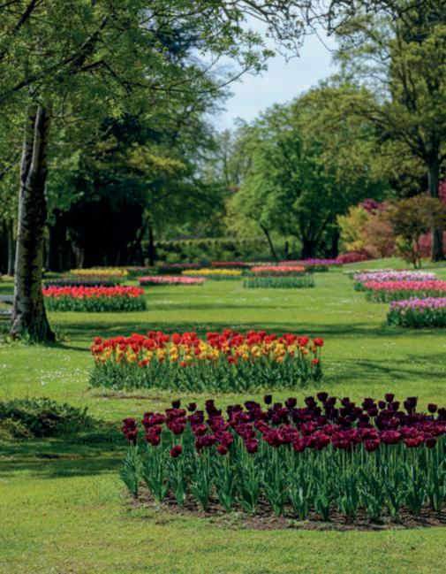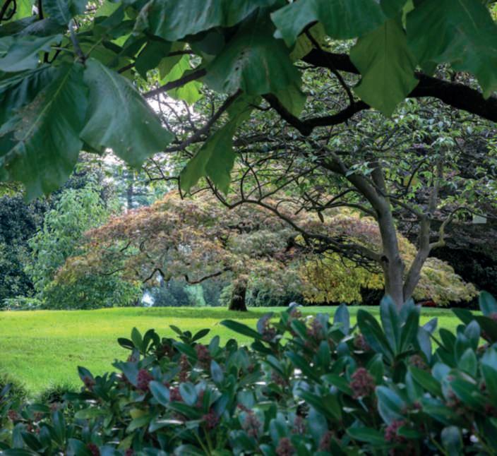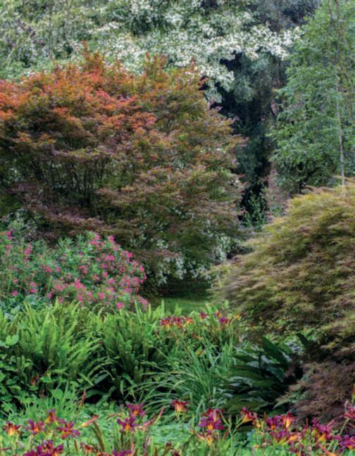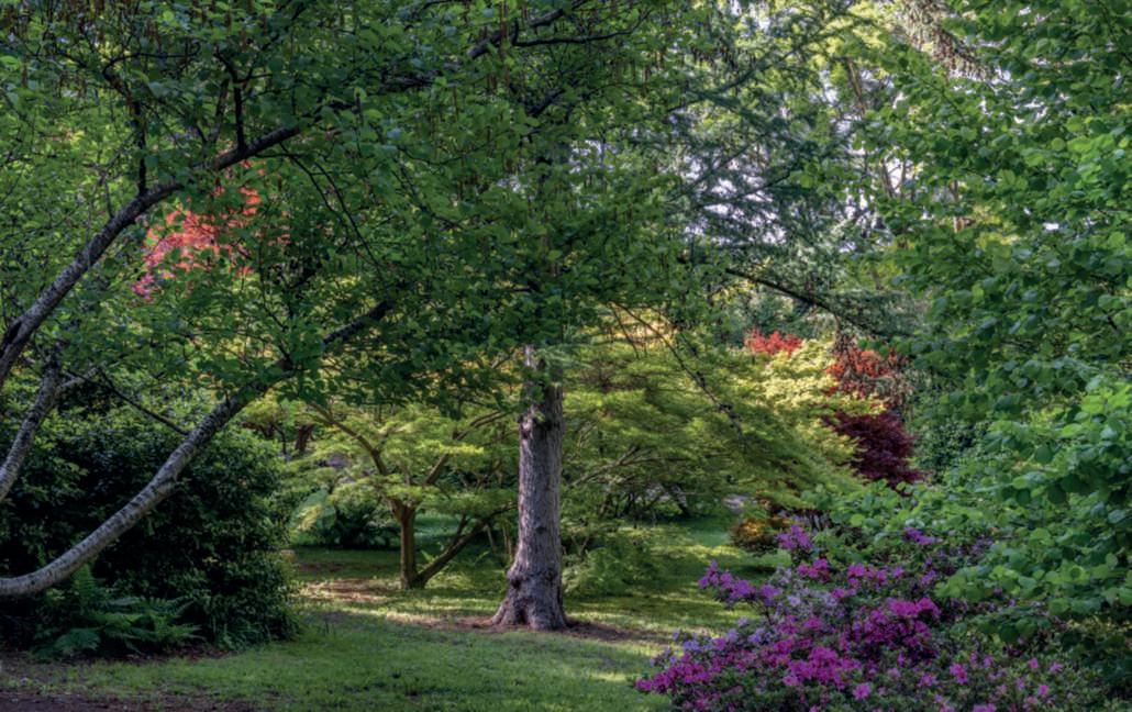 Liriodendrontulipifera.Nella pagina di destra, in alto,una raduranelparcotra la collezionedegli acerigiapponesi ele azalee: si notano gli aghi, glistrobilielacortecciadi Larixkaempferi;inbasso,in sensoorario,dettaglidialcuni aceri della collezione,oltre 50, con portamento,altezza, formaecoloredellefoglie differenti; un pergolatodi glicini e Phormiumtenax ‘Variegatum’;undettagliodi unaborduracon Loropetalum chinense e rododendri