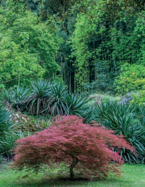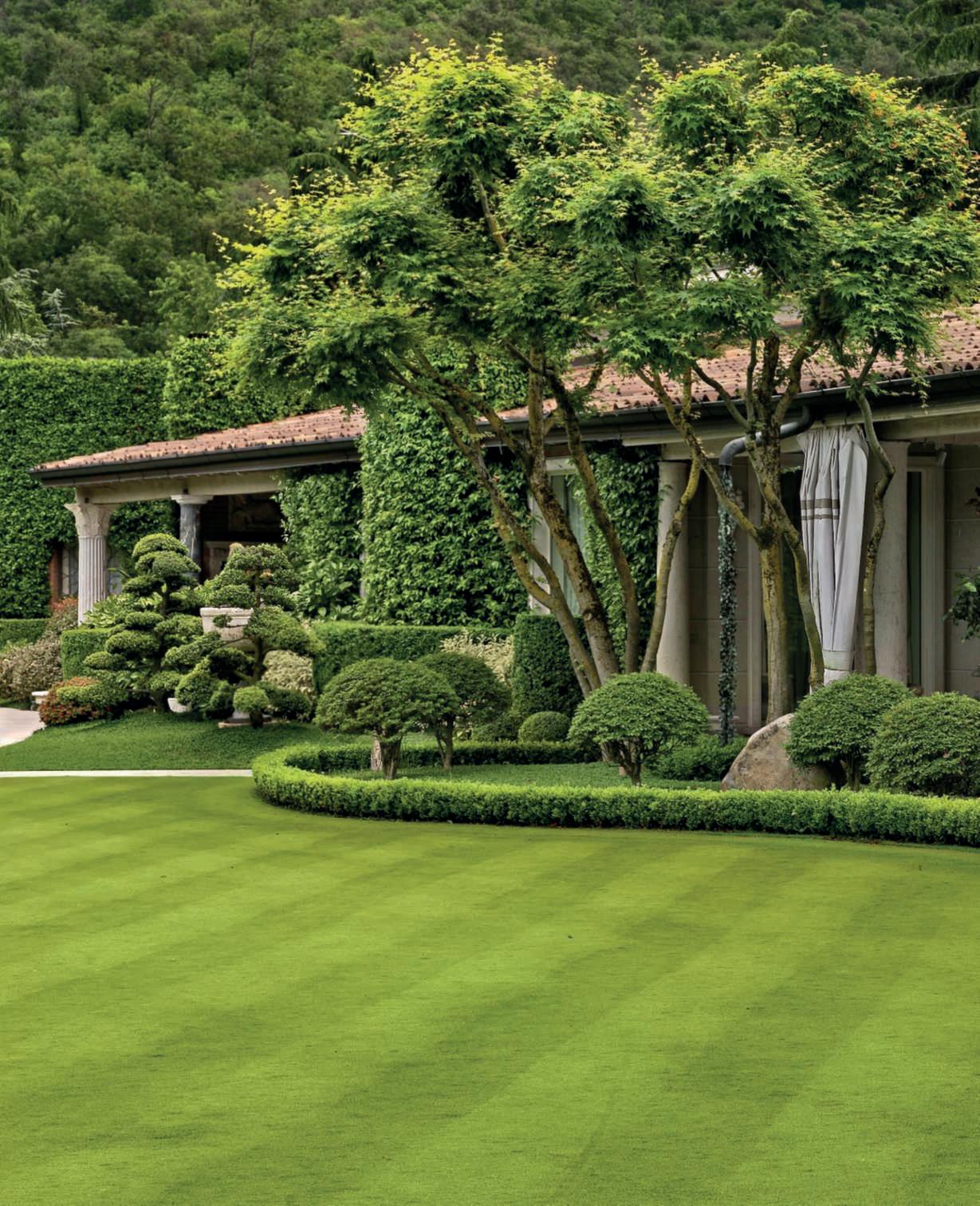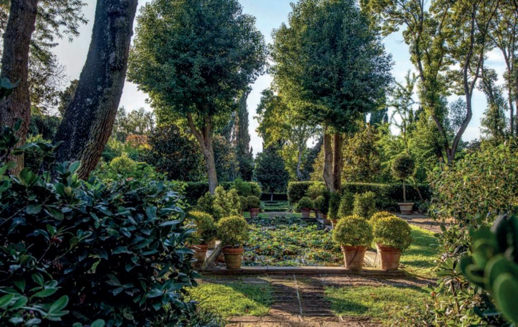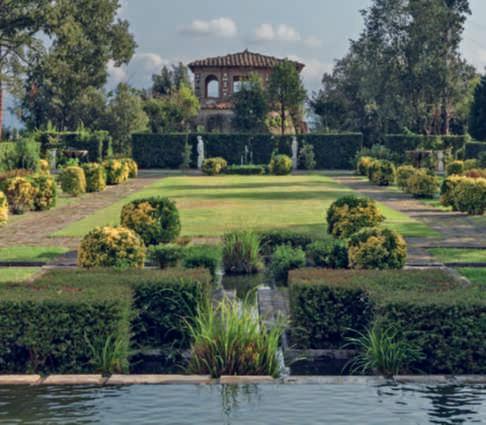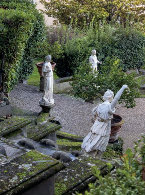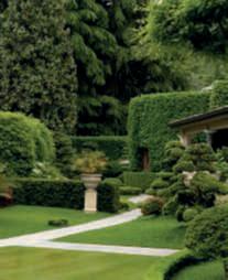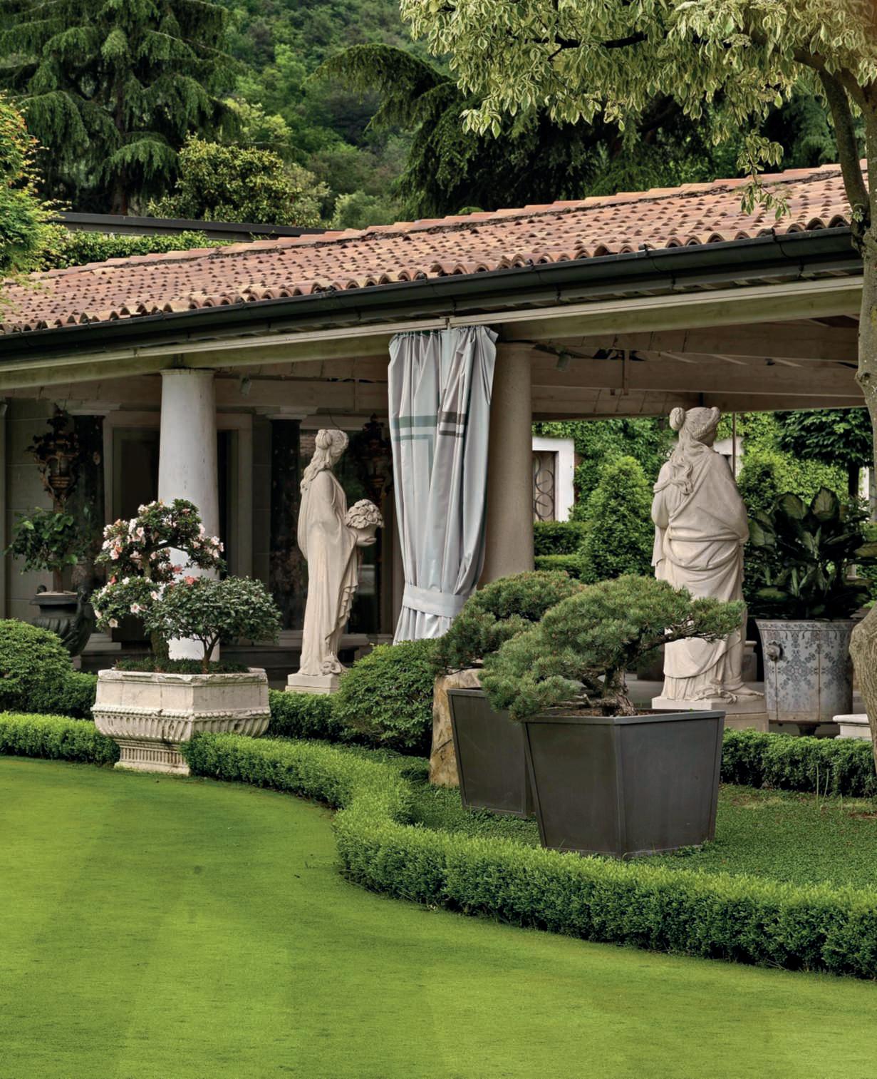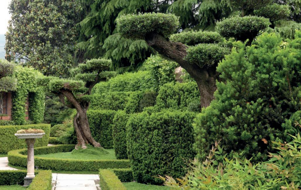 Inquestapagina,inalto, aiuole geometriche connodiin Buxussempervirens ospitano dueesemplaridi Oleaeuropaea macrobonsai; inbasso,asinistra, unavistadelgiardinocon allori informaobbligata sullasinistra, acerigiapponesi,esullosfondo, unesemplaredi Magnolia grandiflora.Quisopra,asinistra, unbustoinmarmodiimperatore romano,probabilmente Ottaviano Augusto,manifatturaitalianadel 600; a destra, Acerpalmatum gruppo Dissectum ‘Atropurpureum Crimson King’ ospitatoinun pozzorinascimentale. Nellapaginadidestra, in alto,