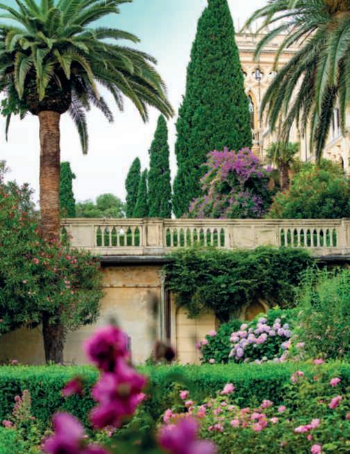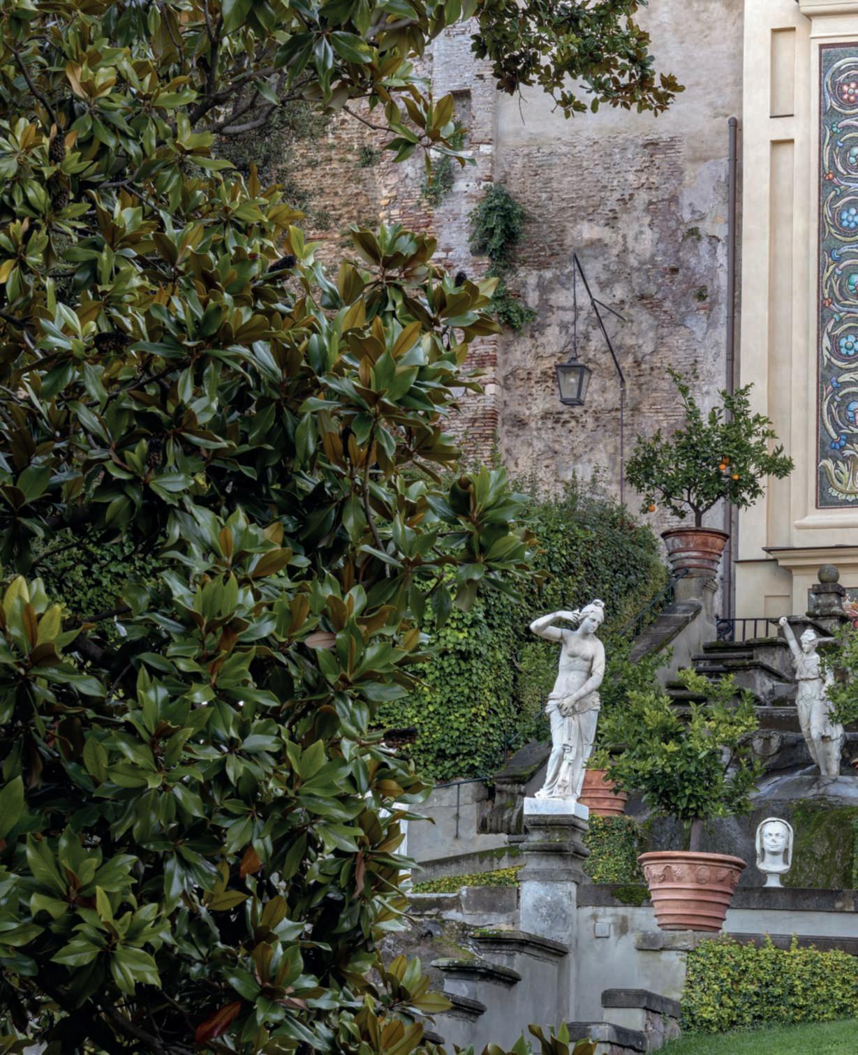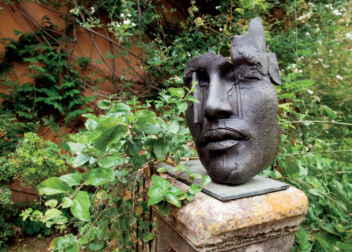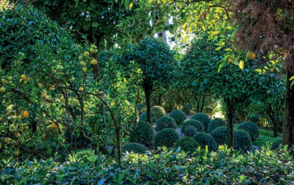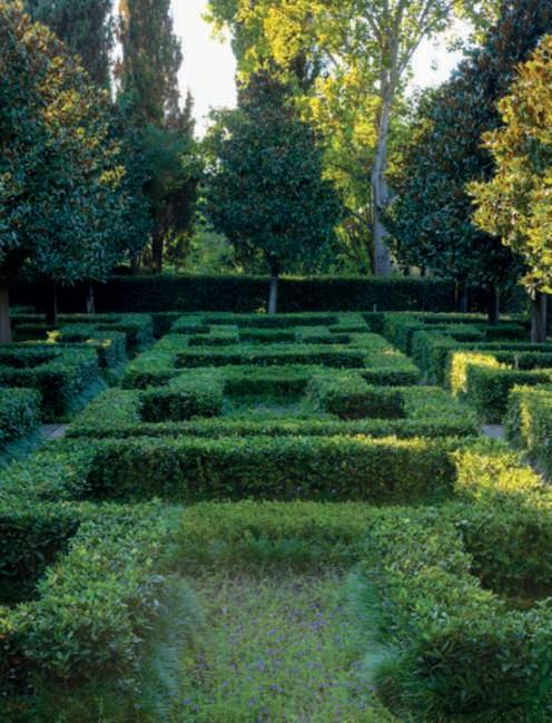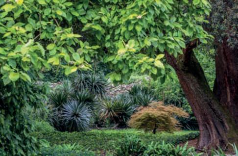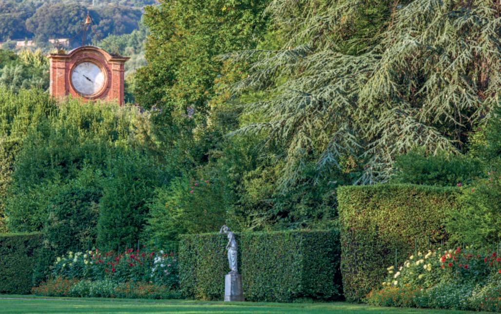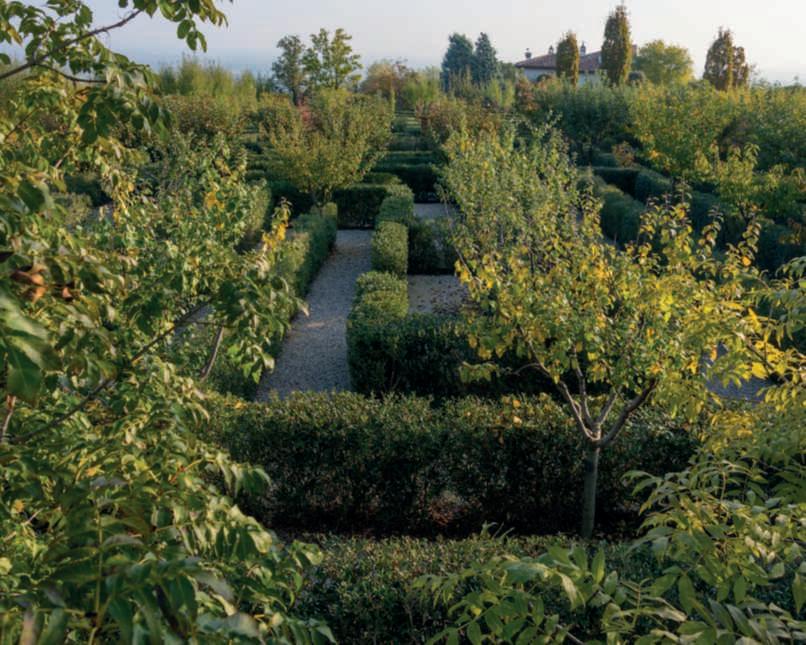 Inquestapagina,inalto, aiuole geometriche connodiin Buxussempervirens ospitano dueesemplaridi Oleaeuropaea macrobonsai; inbasso,asinistra, unavistadelgiardinocon allori informaobbligata sullasinistra, acerigiapponesi,esullosfondo, unesemplaredi Magnolia grandiflora.Quisopra,asinistra, unbustoinmarmodiimperatore romano,probabilmente Ottaviano Augusto,manifatturaitalianadel 600; a destra, Acerpalmatum gruppo Dissectum ‘Atropurpureum Crimson King’ ospitatoinun pozzorinascimentale. Nellapaginadidestra, in alto,