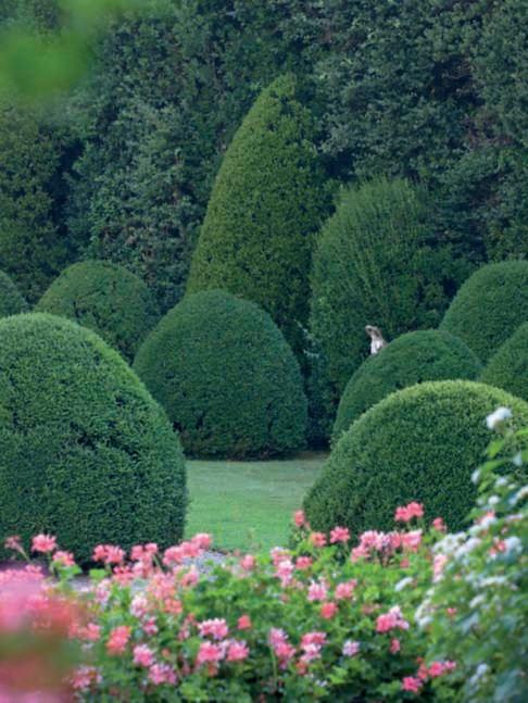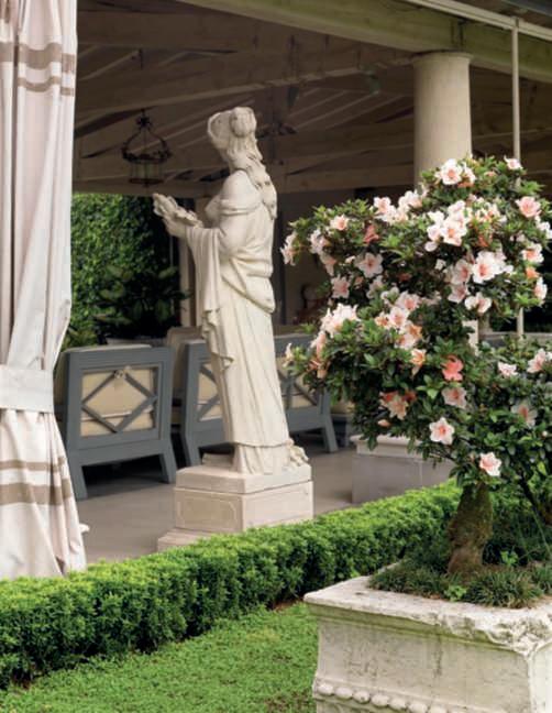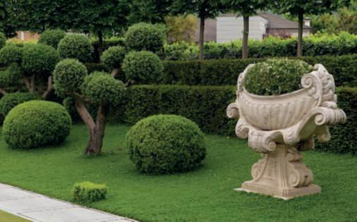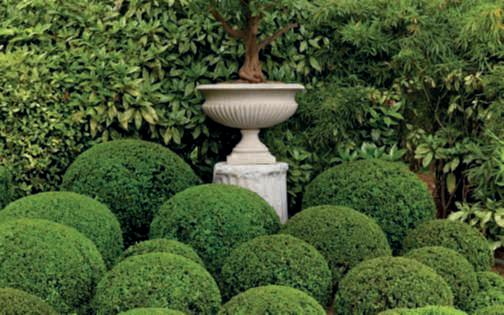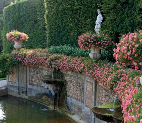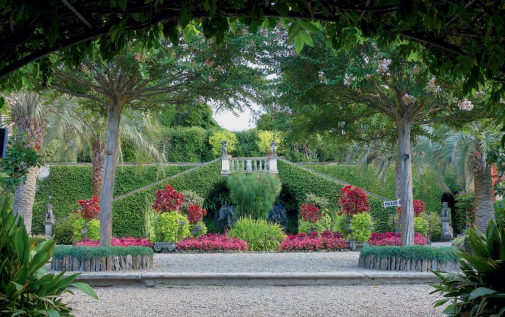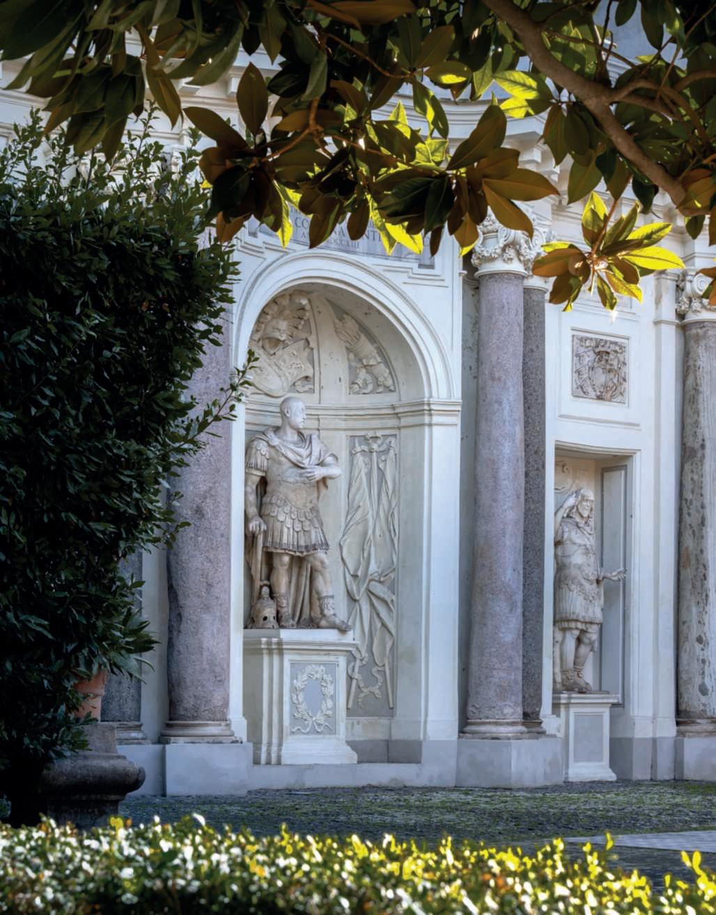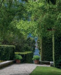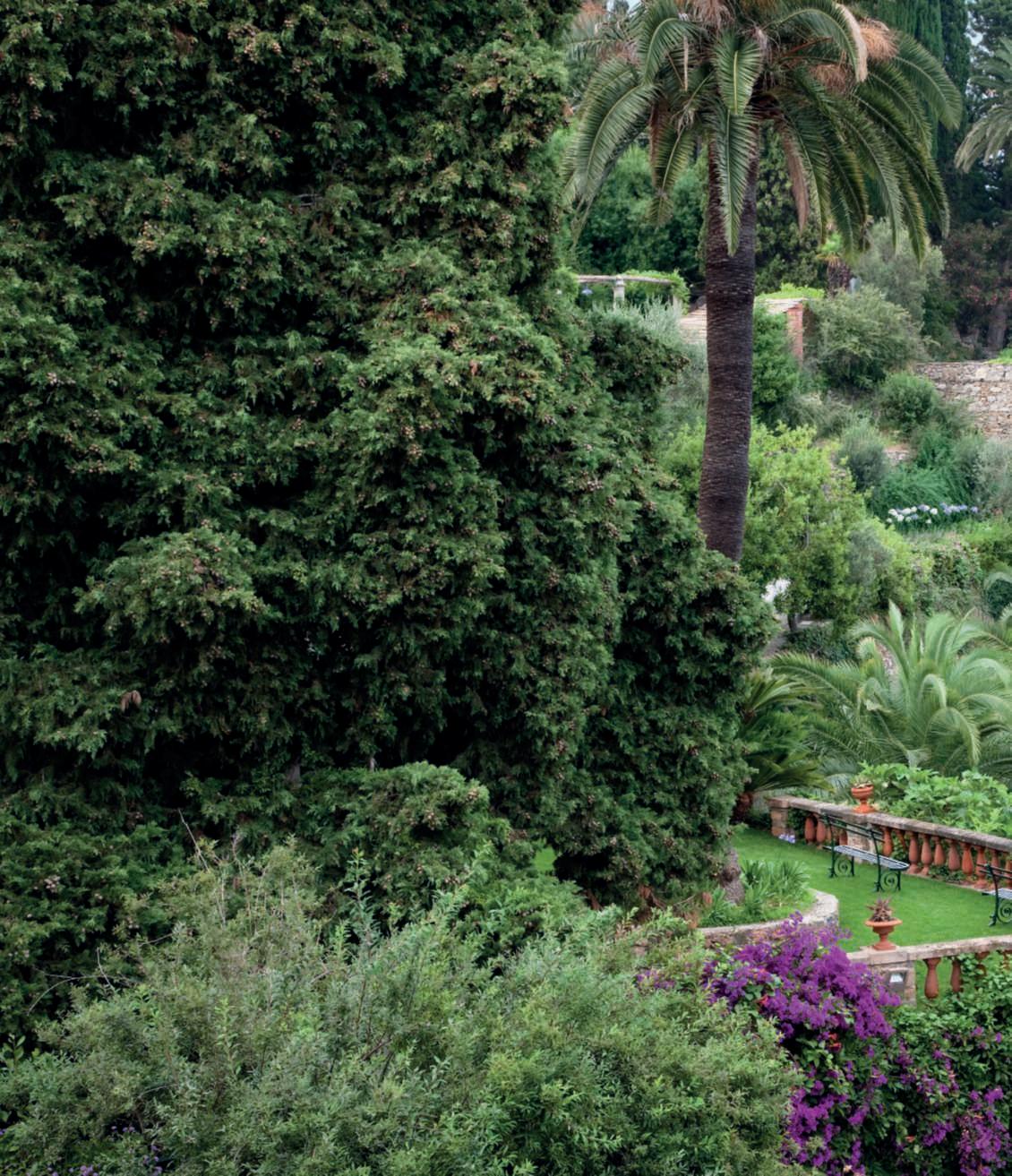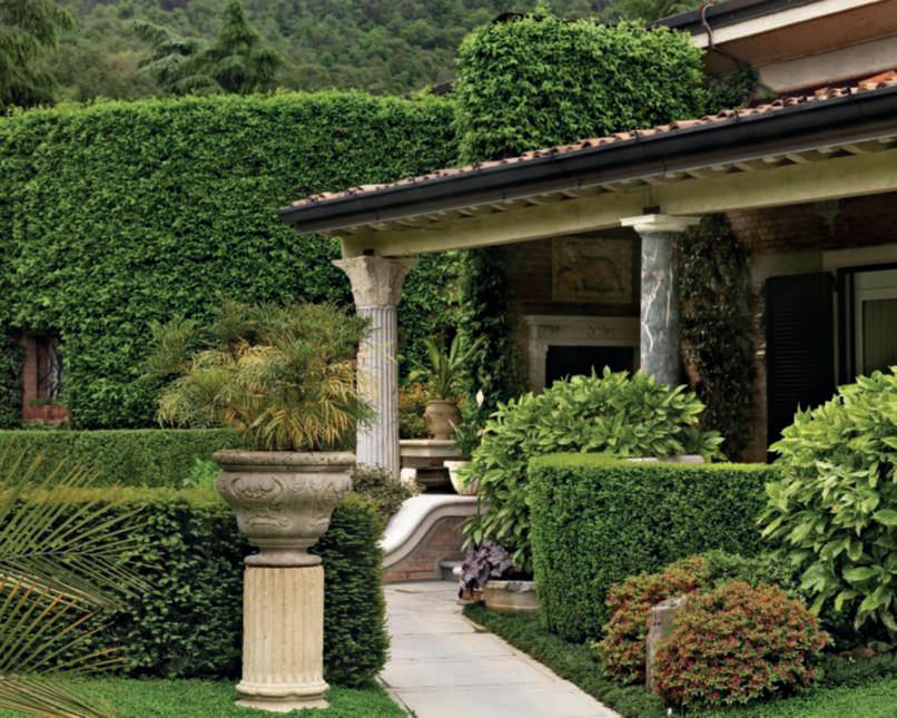 Inquestapagina,inalto, aiuole geometriche connodiin Buxussempervirens ospitano dueesemplaridi Oleaeuropaea macrobonsai; inbasso,asinistra, unavistadelgiardinocon allori informaobbligata sullasinistra, acerigiapponesi,esullosfondo, unesemplaredi Magnolia grandiflora.Quisopra,asinistra, unbustoinmarmodiimperatore romano,probabilmente Ottaviano Augusto,manifatturaitalianadel 600; a destra, Acerpalmatum gruppo Dissectum ‘Atropurpureum Crimson King’ ospitatoinun pozzorinascimentale. Nellapaginadidestra, in alto,