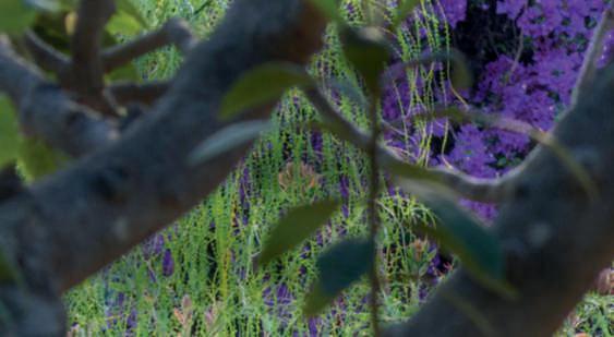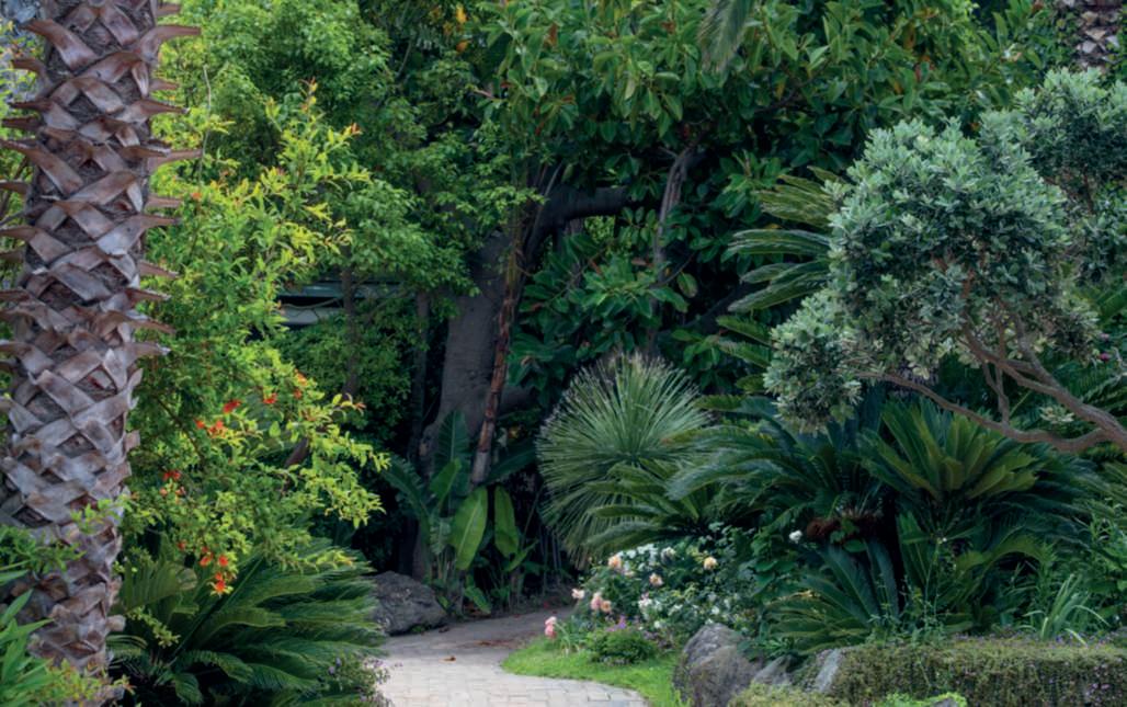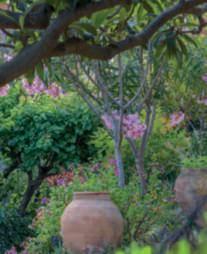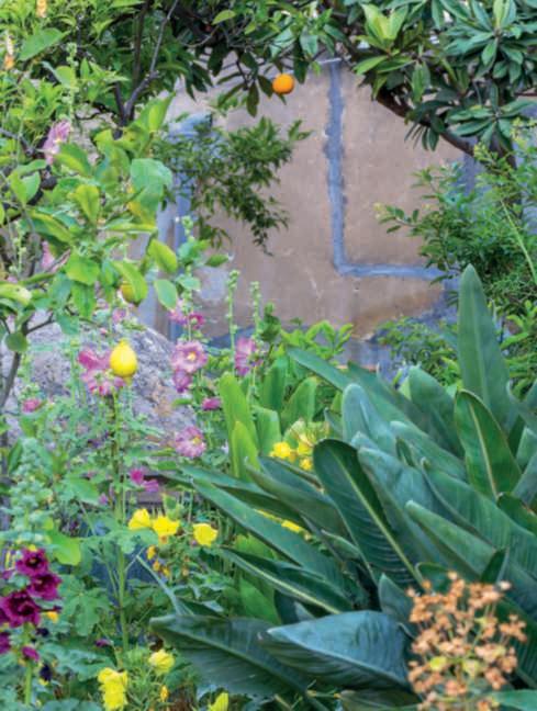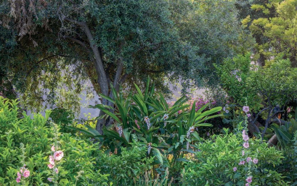 Inquestepagine,einquelle precedenti,dettaglidel secondolivello del giardino, arricchitoda DaphnePhelps: tra alberi di agrumi, albicocco,olivi, Nerium oleander, Eriobotryajaponica egrandi Strelitziareginae,le fioriture di Oenothera biennis, Alcearosea bordeaux e rosa, Lantana camara, Bougainvillea glabra ‘Sanderiana’, Jasminum grandiflorum, Pelargonium profumati, Caesalpiniagilliesii, Callistemoncitrus e Alpinia zerumbet