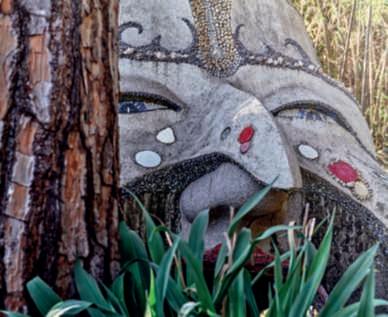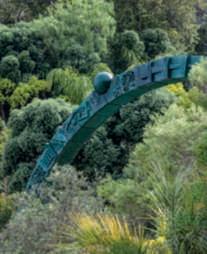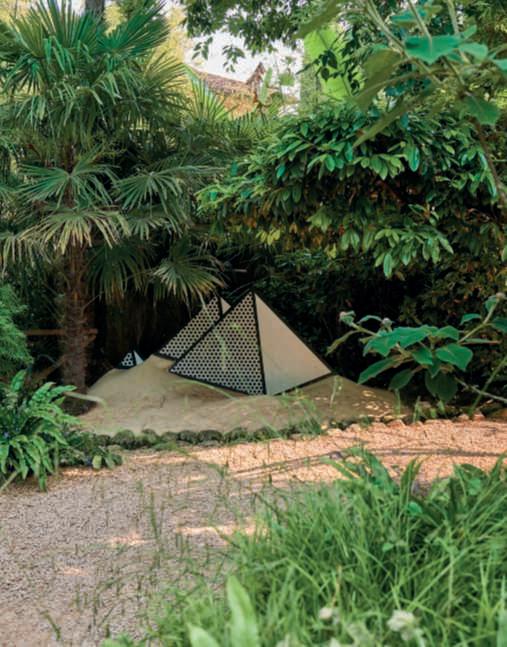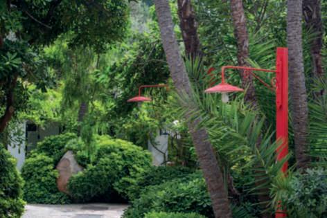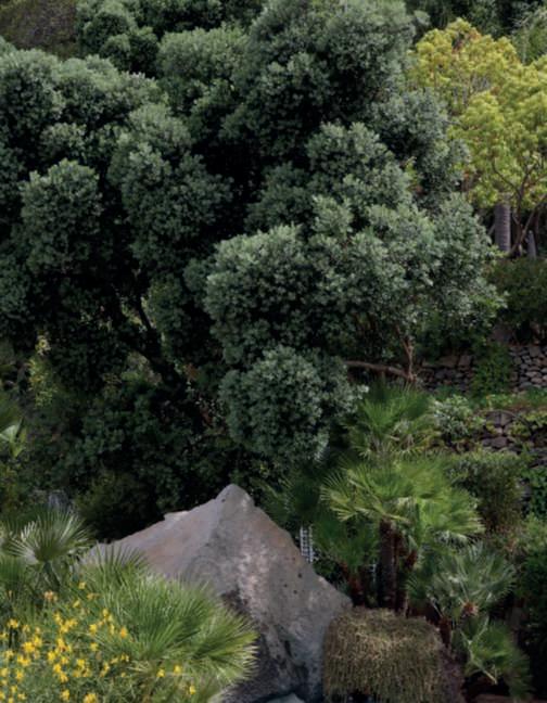 In questa pagina,inalto,lasalita, tra Trachycarpusfortunei,al BucoNero,unapiscinainuna grottanascosta;inbasso,vista dell’ingressoalParcoconl’opera Roots di BettinaButtgen Nellapaginadisinistra,inalto, ilvialed’ingressoallepiscine tra Punicagranatum, Dasylirionglaucophyllum, Cycas, Strelitzia, Feijoasellowiana, rose e Delospermacooperi;in basso,vistadi Templare,piscina con doccioni cervicali,progettatada ErmannoCasasco e, nellafotosotto,unvialedel parcoconvivacilampioncini rossichespiccanotrailverde di Pittosporumtobira, Schinus molle e i fustidelle palme