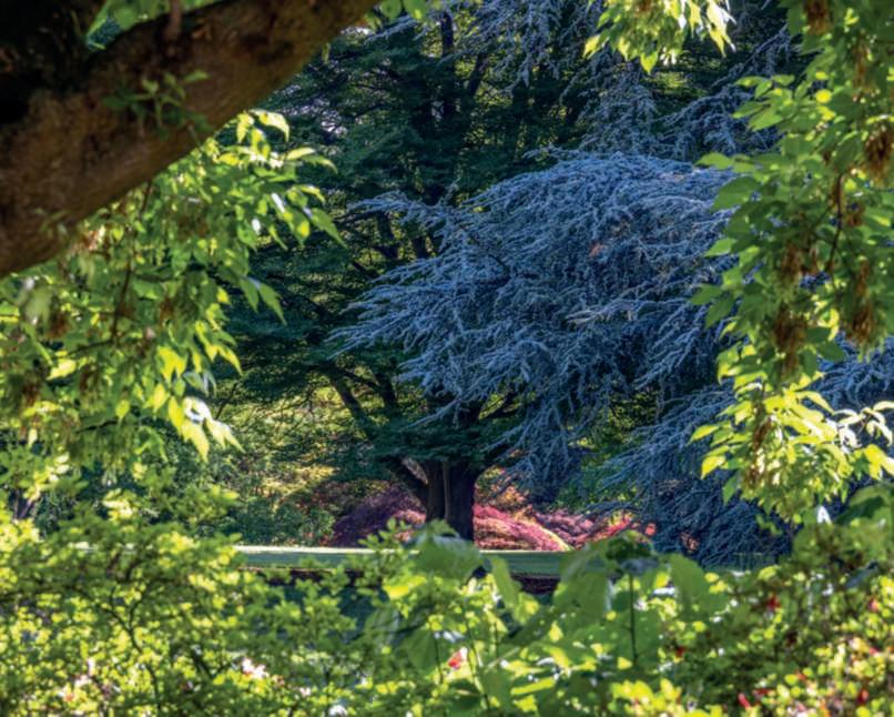 Inquestapagina,inalto,una vistadella collezionediaceri giapponesi dalmargineoccidentale del parcoattraversogli alberi: sinota Cedrusatlantica ‘Glauca’; in basso, una bordura diazaleeefelciall’ombradi