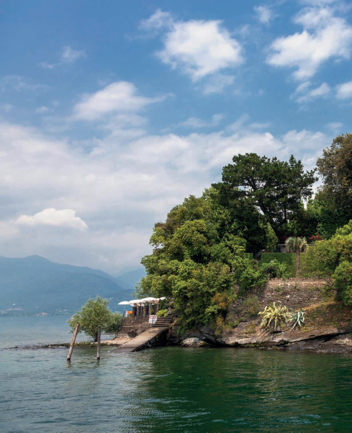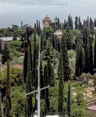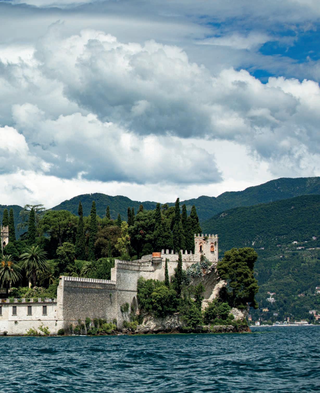 Apocopiùdiduecentometri dal promontoriodiCapo SanFermo,nelcomunedi SanFelice del Benaco,sulla spondabresciana del lago, IsoladelGarda è un giardino didelizie esaltatodaunavilla instile neogoticoveneziano Nellafotodiquestepagine, unavistafrontaledellavilla ediparte del giardino,come appaionoachiarrivadallago.