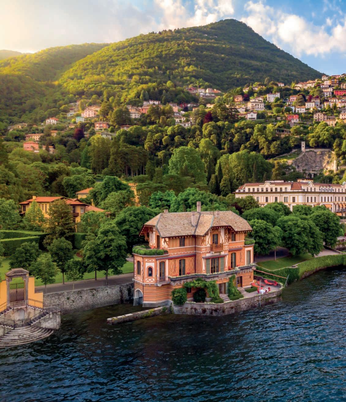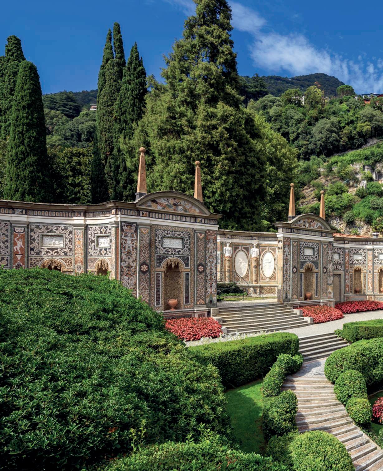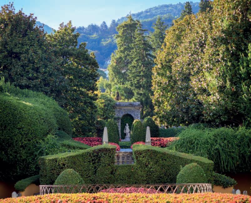 IllagodiComoèdasecoliunadellemetepiùglamourd’Europa e del mondo. I suoi paesaggi con le Alpi a fare da sfondo,unmicroclimamitechehaconsentitolacreazionedi giardinirigogliosielalungastoriadivillesontuosehannoincantatoiviaggiatoriditutteleepocheecontinuanoa esercitareillorocharme.Lungolerivesonosituatiborghi difascinoetraquesti,incastonatotraillago,sullasponda sud-occidentaleaunpassodaComo,eilMonteBisbino, Cernobbioèunagemmanascosta,dallostiledivitarilassatomaurbanchicerinomataperlesueresidenzeraffinate,tracuispicca lameravigliosaVillad’Este.Dal1873prestigiosoalbergodallussoesclusivoediscreto,èsituatainun’insenaturanaturaledove“lemontagne sisonoritirateasufficienzaperlasciareunadolceacclività”,percitare Edith Wharton, ed ècircondata daun parco di dieci ettari. Ilcomplessochesipuòammirareoggièfruttodicontinuemigliorie eadattamentideiluoghiallemodedelperiodo,siadalpuntodivista architettonicosiadaquellopaesaggistico.IlnucleooriginariofuVilla Garrovo,nomemutuatodalquellodeltorrentechetuttoraattraversail parco, fatta costruire nel 1568 dal Cardinale Tolomeo Gallio su progetto che tradizionalmente si fa risalire a Pellegrino Tibaldi, uno dei più noti architettiepittoridellasuaepoca,cheverosimilmentesioccupòanche deigiardini.GlieredidelCardinalecontinuaronoafrequentareead abbellirelaproprietàpercircaunsecolo,facendolaconoscereintutta Europaospitandol’aristocraziadeltempoma,dopoessersitrasferitia Napoli,neperserointeresse.Ebbecosìiniziounaseriediacquisizioni miratearenderelavillaunluogoincantevoleincuisoggiornare,ospitareetenerebanchettiefesteelegantichehannocaratterizzatolavitadi questoluogopercircaduesecoli.Alcuniproprietari,invece,lasciarono un’improntaindelebile.IlMarcheseBartolomeoCalderara,dal1784, restauròlavilla,ampliòigiardiniediedeloroun’impostazioneall’italiana.Fecedefinireancheunlungoasseprospettico,insalitadallago, cheattraversaunimponente ninfeodiciottolipolicromichedisegnano arabeschi,arricchitodabassorilieviepinnacoli, in stilebarocco, e siconcludeconunanicchiaalcuiinternoèpostoilgrupposcultoreodiErcoleeLica.Lofececosteggiaredacipressichefiancheggianounaduplice catenadiconcheinpietraacascatacheincanalaleacquedelGarrovo. SuamoglieVittoria,unavoltavedova,sposòungeneralenapoleonicoe perluifececostruirealcunepiccolefortezzedigustoneo-medievalesul fiancoroccioso di una collina, un tratto della quale quasia strapiombo sullago,raggiungibilitramiteunaseriedisentierichesidipartonoda piùpuntidelparcoecollegatitraloro,anchetramiteponticelli,immersi nella vegetazione naturale ma controllata da mano invisibile. AltrafigurafondamentalefuquelladiCarolinadiBrunswick,Principessa di Galles e consorte in esilio delfuturo re Giorgio IV; alei si devonogliampliamentieleprincipalitrasformazioniarchitettoniche della villa, che assunse un aspetto neoclassico, e il cambiamento del suo nomeinVillad’Este(perunaremotaconnessionedellaPrincipessacon lafamiglia).ACarolina,cheapparvesullascenadiCernobbionel1815, sideveunaparzialetrasformazionedelparcoall’italianainunopaesaggistico e pittoresco, un’evoluzione della tendenza dominante in Inghilterradal700,moltovicinaallostiledell’ultimoHumphryRepton(uno deigrandipaesaggistiinglesidel700),conlepartiformalipiùvicinealla residenzaeafaredatramitetraquest’ultimaealtrepartipiùinformali nellostileeirregolari,consentierisinuosi,gruppidialberichesialternanoapratiemacchiediarbusti;fucostruitoiltempiettodiTelemaco,