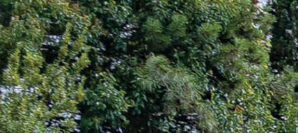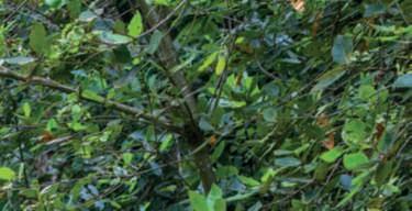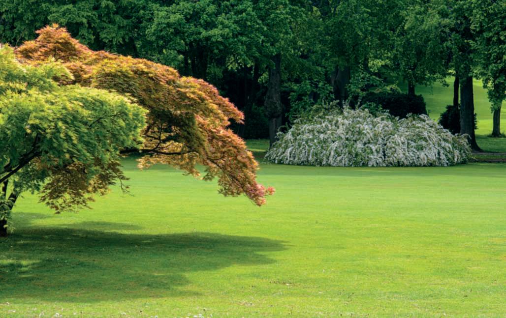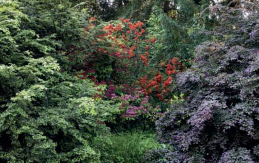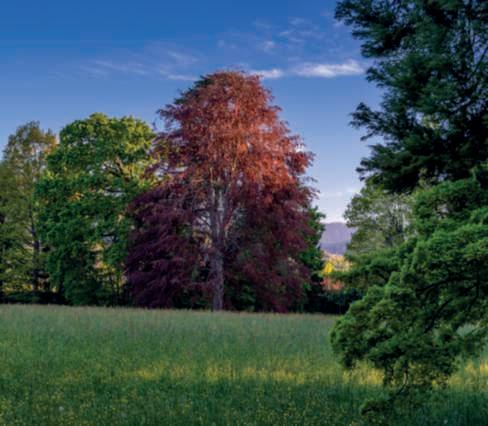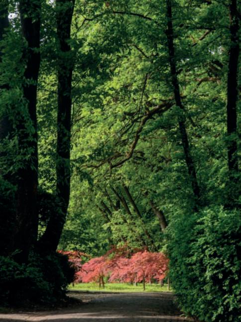 Nellapaginadisinistra,untratto del viale dei bossi che costeggia il grandeprato, con le foglie verde chiarodiuna Quercusrobur e i fiori di Camelliajaponica,dicuiil castellohaunabellacollezionei;al centro, vecchi e giovani esemplari difarnia(Quercusrobur);in basso,esemplare monumentale di faggiorosso.