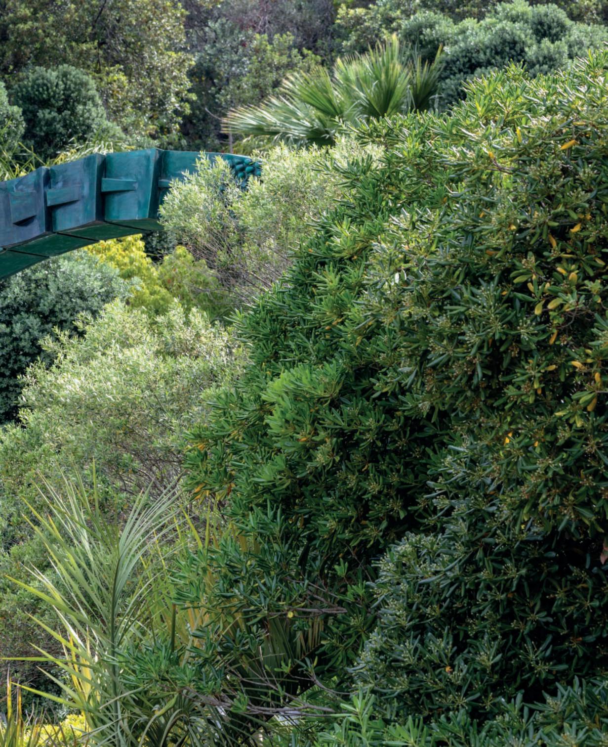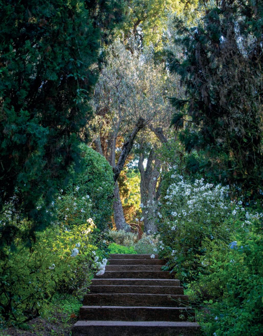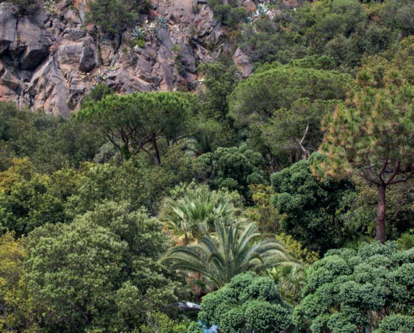 Inquestapagina, unoscorcio delparcoconilmixdipiante mediterraneeinsensolato sullosfondodelMonteVico; inbasso,asinistra,passaggi nelparco;inbasso,la Piscina dell’Arco,neipressidella scultura Arc-en-ciel di Arnaldo Pomodoro,ritrattanelle pagineprecedenti. Nellapaginadidestra, in alto, Maya,unapiscinakneipp,tra Bougainvillea in fiore,Cycas eMelaleucacitrina;inbasso, la salita alle balze tra Syagrus romanzoffiana, Trachelospermumjasminoides, Pittosporumtobira