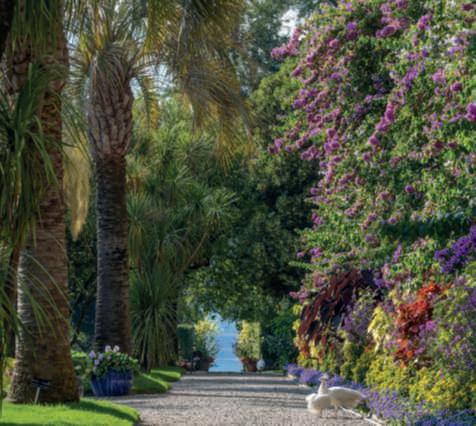 cipressi;inbasso,asinistra, unoscorciodelgiardinocon Phoenixcanariensis gigantea;inbasso,adestra, einquestapagina,il garden di LadyCharlotte chiusodauna siepedialloro con rosearbustive, Euryopspectinatus frutto, Trachycarpusfortunei