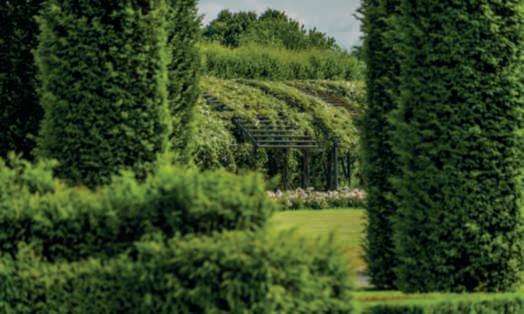 bossipotatiasfera e Ilexcrenata, tenutisecondo latecnicaNiwaki Nellafotosotto, scultura in pietra arenaria grigia diJanPieterVan BaurscheitilVecchio (1669-1728); sullosfondo Chamaecyparisobtusa. Inaltoadestra, di Rhododendron coltivatoinvaso. Nelle foto in basso, insensoorario,bossipotatiasfera e sullo sfondo Aucubajaponica;una vascacon Equisetumhyemale e ninfee; uno scorcio delgiardino conl’ingresso all’HortusConclusus (Giardino di Minerva); Miscanthus sinensis dalqualespiccaungruppo di gruornamentali dimanifattura giapponese delXIXsecolo.