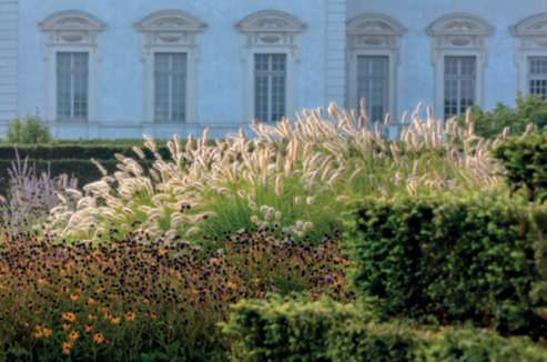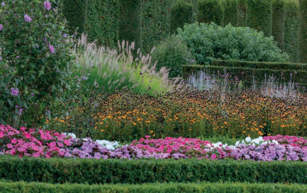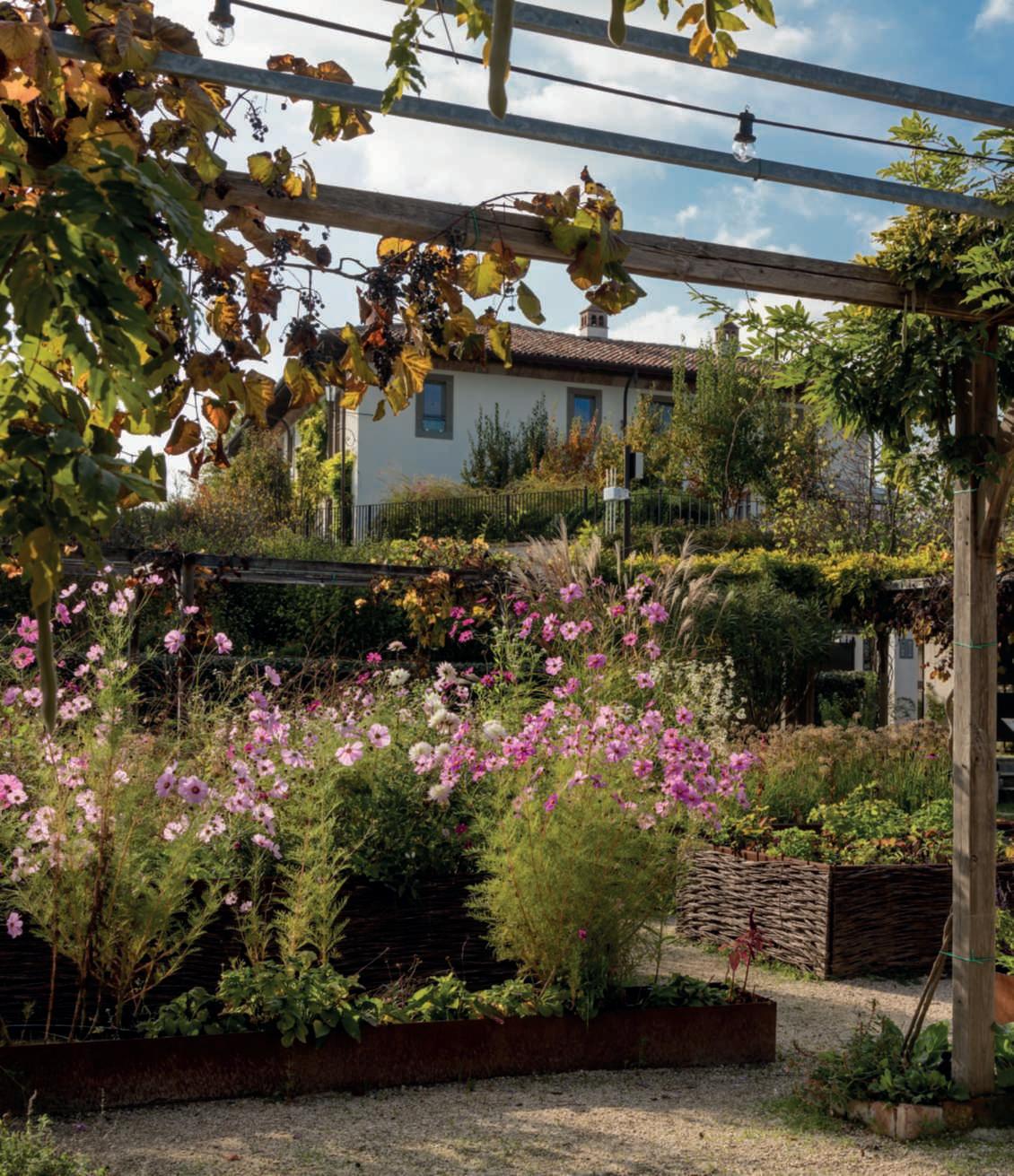 Nellapaginadisinistra,in alto,la finestra sul paesaggio ricavatanella siepe di carpino, alterminediun arco di noccioli;inbasso, unavistadella parteinformaledelgiardino diVillaAmagioia,con Pinus pinea inprimopianoequindi Miscanthussinensis, Teucrium fruticans, Punicagranatum (melograno)e Ficuscarica (fico) già nella livreadorata autunnaleeuna quercia della collezione, conilcartellino di identificazione. Inquesta pagina,inalto, unavistadel parcodavantia PalazzoBargellini - Bentivoglio.Inprimo piano Rosa ‘Alba Meidiland’, nellabordurainsecondopiano punteggiatada cipressi, lavanda, Hypericum × hidcoteense ‘Hidcote’, Phormiumtenax ‘Variegatum’.Lasculturadi Eros Mariani raffigura Marco Emilio Lepido, cui si deve la costruzionedella Via Emilia Quiasinistra,il dedaloin Phillyreaangustifolia progettato da SandroRicci.Nellepagine precedenti,unavistadell’orto grande di VillaAmagioia,un potagerencarrés racchiuso da pergolati di glicine e Vitiscoignatiae.Nellevasche trovanoposto,traglialtri, dalie, Cosmosbipinnatus, zinnie e Allium invarietà.
