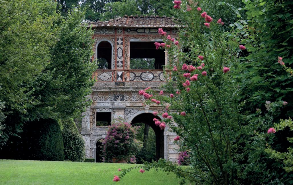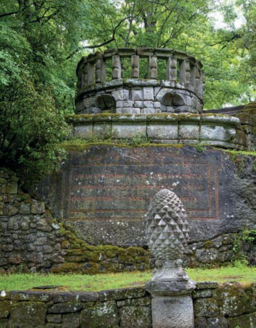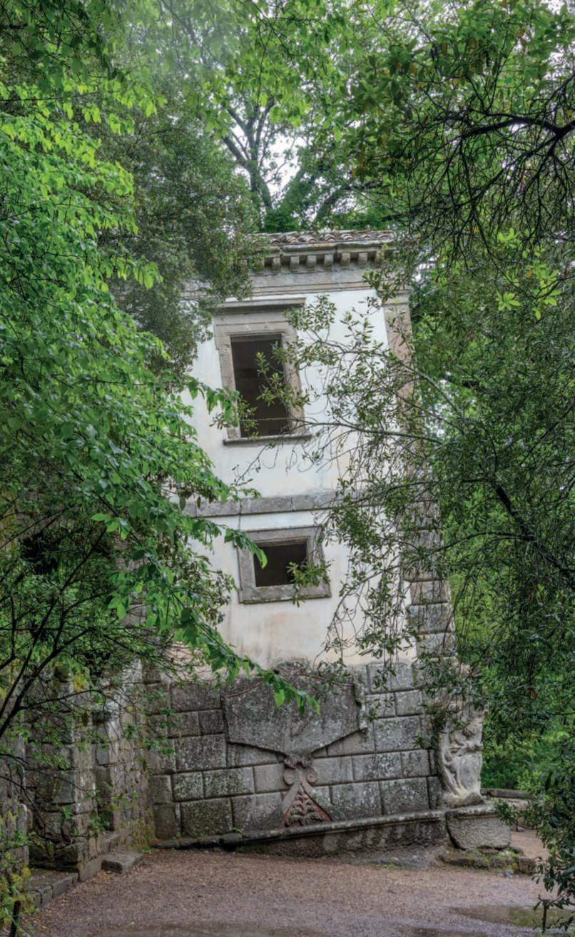 Inquestapagina,quiasinistra, l’Arco del Pastore,inassecon l’ingressodella VilladelCardinale,tra Magnolia grandiflora,muridiarbustisempreverdi e Lespedezathunbergii;in basso,asinistra, unavistadel giardinodaunodeivialiche risalgono la collina: si ammira l’imponenzadellegrandi alberature che fiancheggiano il Vialedell’Ercole eildisegno delle radureconmacchiedi arbusti;inbasso,adestra,una vedutadall’altodell’ortodello Chef,racchiusodasiepidi Trachelospermum jasminoides. Nella pagina disinistra,in alto,il tempiettodiTelemaco; inbasso, una vista del Viale dell’Ercole,fiancheggiatoda una duplicecatenadiconche inpietraacascata alimentate dal Garrovo e da cipressi, Magnolia grandiflora e qualcheleccio. Nelle pagine precedenti, una vistalateraledel ninfeo,o Mosaico, nei giardinialago, conilvialed’accessodelimitato da bossiinformaobbligata ebordurecoloratedipiante annuali.