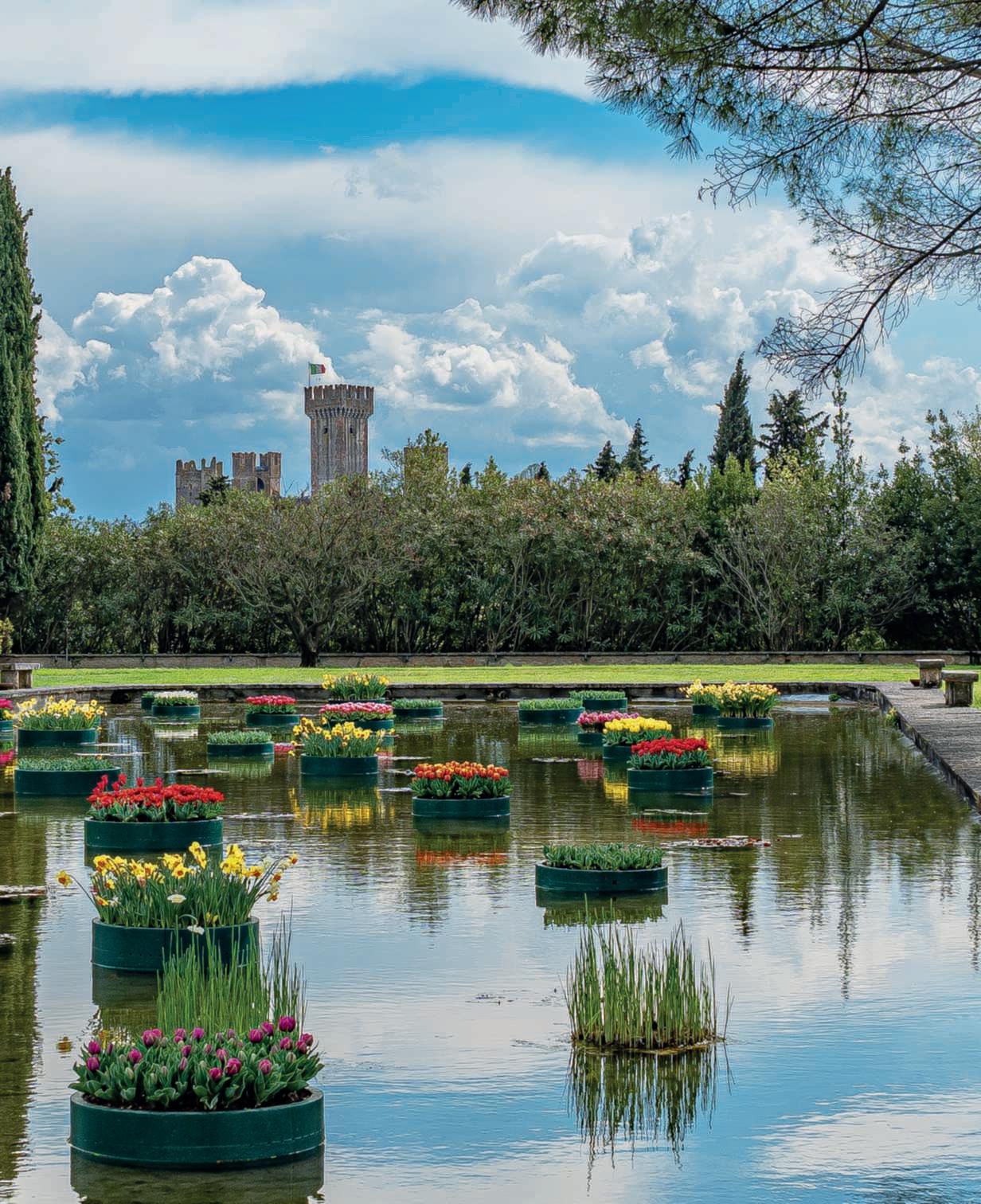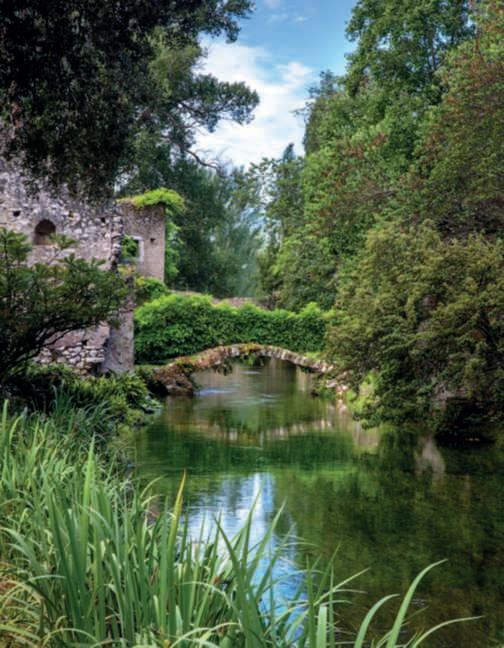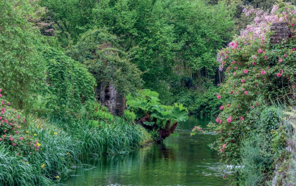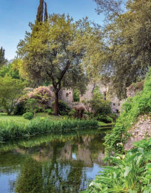 Italiaèriccadigiardinibellissimi,entusiasmantiosapientementecostruiti. Tratuttiquesti,tuttavia,Ninfaresta un unicum .Ilgiardinosiestendetrale suggestiverovinedell’anticacittàdi Ninfa,unanticoborgosortoaipiedi deimontieaimarginidellepaludi dell’AgroPontino,divenutocosìun nodocrucialepericommerci.Anche dopolacadutadell’ImperoRomano,ilvillaggiohaconosciutovicissitudinidurantetuttoilMedioevo,semprelegateinmodointricato,siaperlasuavicinanzageograficacheperlefamigliechela governavano,allastoriadelpapato.Messaaferroefuocoprimadal Barbarossanel1171einseguitonel1378,fuprogressivamenteabbandonata,tantochepersecoliseneperseroletracce.Riscoperta sulfiniredell’800daFerdinandoGregorovius,unviaggiatoreestoricotedesco,risorseanuovavitadal1920peroperadellafamiglia Caetani, proprietaria del luogo dal 1298. Le mura, la torre, la diga, il castello, il municipio, le chiese e molti altri edifici civili, liberati dallavegetazionesimostraronoconservatiassaimegliodiquantosi sarebbepotutoimmaginare.Unaparteèstatarestaurataeunaparte,quellacheanimailgiardinoeaccompagnaduranteilpercorso dellavisita,soloconsolidata.Trasformataintenutadicampagna, impegnòtregenerazionididonneperlasuarealizzazione.Ada, MargueriteeLelia,passandosiiltestimone,sonoriusciteadare un’improntaunicaalgiardinoriuscendoaintegrareperfettamente irestistoricicheoranonsembranopiùrovinedecadentimaelementisapientementemescolatiamasseverdi,colorichecambiano distagioneinstagione,corsid’acqua,formechesiprotendonoverso l’azzurro,zoned’ombrachepaionoboscooforestaeampisprazzidi cielo.Ungiardino,ancheperleoriginielaformazionedellesue artefici,all’inglese,malontanodallariproposizionedischemieabbinamentigiàvisti,piùchemai,esenzapauradisovvertireregole apparenti,allaricercadellospiritodelluogo.Lelia,ultimadiscendentedellafamigliaCaetani,seppeavvalersialmegliodelsuotalentopittoricoperinfonderealgiardinoquelcarattereromanticoche oggilocaratterizzaechefasembrarenaturaliattenzioni,particolariecesellature.Lamedesimadifferenzafrailmetalloeilgioiello che se ne ricava, con impegno e fatica, dopo un lungo lavoro. Sepocopiùdiunsecolofaquestoluogoerapressochéabbandonato,