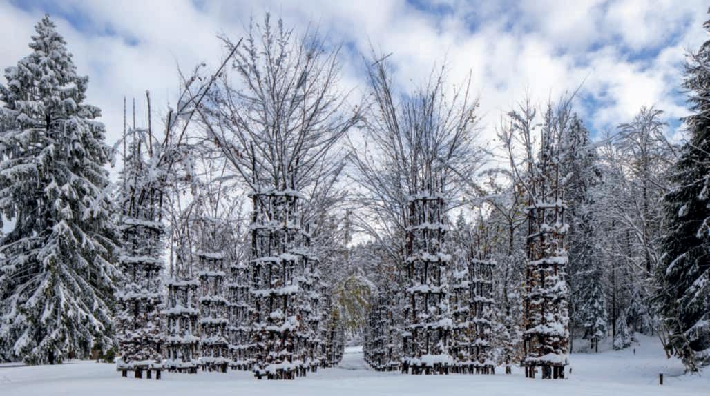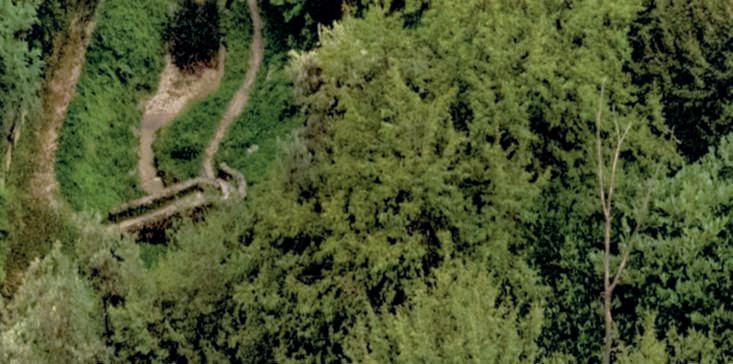 Nellapaginadisinistra, in altoasinistra,il NidodiSella II/Sella Nest II di Nils-Udo, 2008-2017, Malga Costa: cinque pezzi a forma di uovo in marmo chiarolevigato poggiatisughiaiaeracchiusi all’internodiunnidoprotettivo,cerchioformatodatredici carpiniimpalcatialti;inaltoa destra, Simbiosi di Edoardo Tresoldi,2019, Malga Costa: realizzata a seguito della tempestaVaiachehacolpito ilTriveneto nel 2018,l’operaè unastrutturaarchitettonicain
