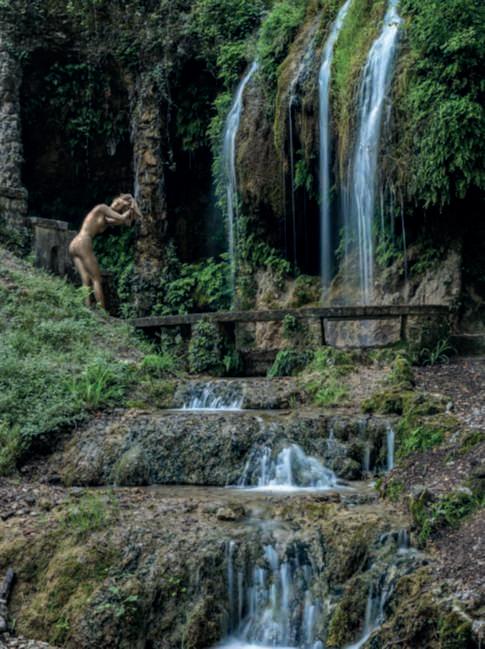 Nella foto della pagina di sinistra,unavistadella Valletta dell’Acquapazza edellesue cascatelle,con Laragazzache siasciugaicapelli (1999), operainbronzodi Venanzo Crocetti