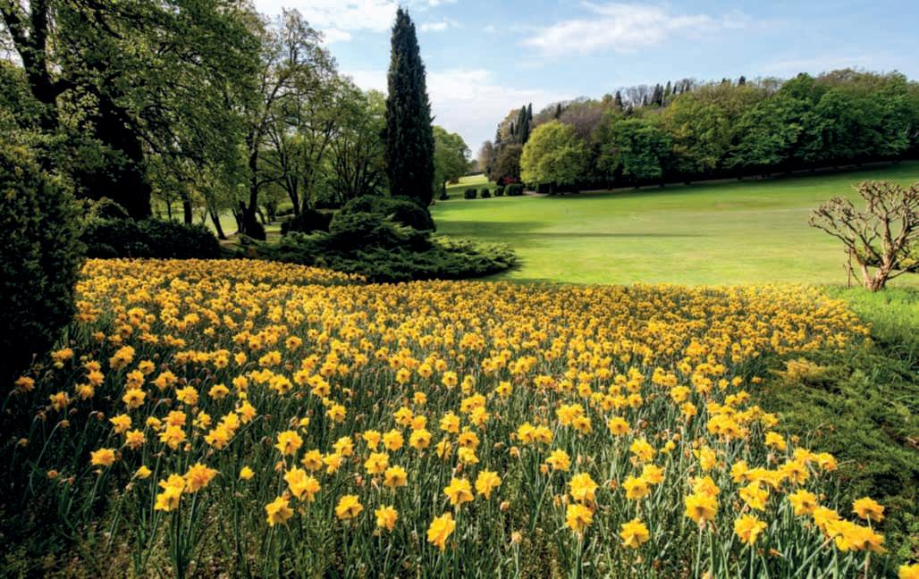 Inquesta,pagina,inalto,uno scorcio del parco in primavera.Si notano,traglialtri, da sinistra Sequoiasemprevirens, Fagus sylvatica ‘Asplenifolia’, Liriodendrontulipifera (alberomonumentale alto 43,5 metri) e Cryptomeria japonica ‘Elegans’ Inbasso, l’angolo delle camelie.
