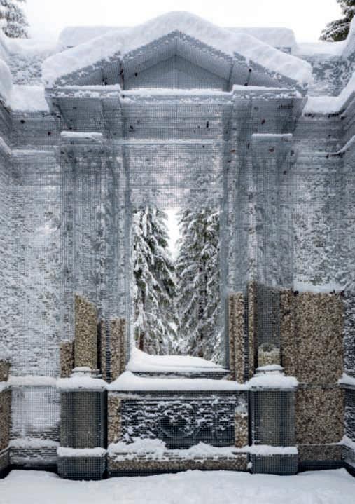 retemetallicaepietra che si protendeversoilcieloesimboleggialarovina e la fragilità dellecose;inbasso, CattedraleVegetale/TreeCathedral di GiulianoMauri,2001,Malga Costa:ottantapilastri,costruiti conmigliaiadiramiintrecciati traloro, si alzano fino adodici metridialtezza, curvandosi poiaogivaperaltritre metri,simulandolenavateele voltedellecattedraligotiche. Ognipilastrocontieneun carpino,destinatoneltempoa sostituirsialsuotutore.L’opera,