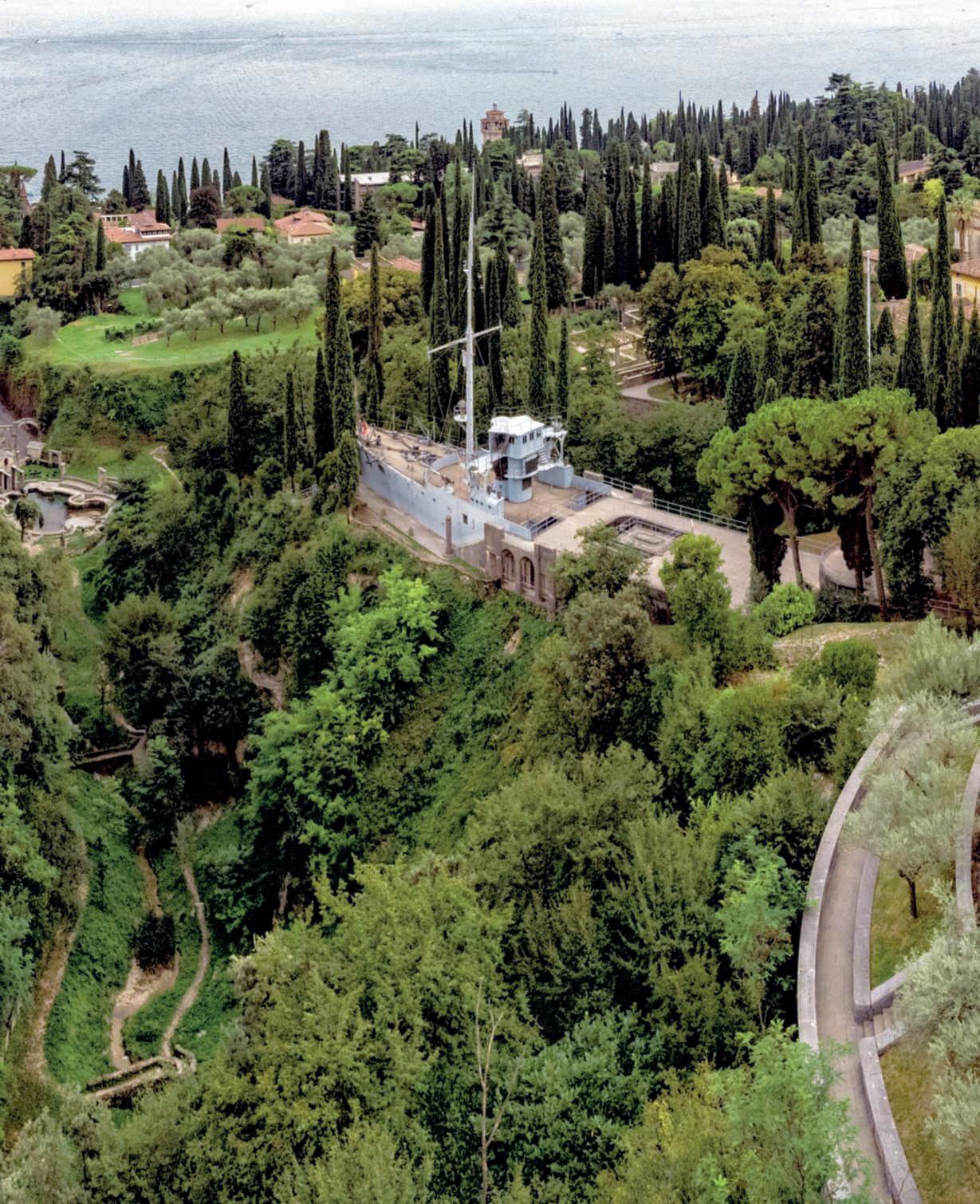 Inquestapagina,inalto,vista della RegiaNavePuglia, unarietetorpediniereche terminòilsuoserviziodopo laPrimaGuerraMondialeefu donatoad’Annunzio.Perilsuo trasporto,smontata,aGardone furononecessariventivagoni ferroviari.Oggi lasuaprua, con il ponte di comando, è incastonatainunacollinadel parco.Inbasso,il Laghetto delleDanze,uninvasoin pietra a forma di violino,dove confluiscono le acque due rivolidellaVallettadell’Acqua pazza e diquella dell’Acqua savia, entrambiramificazioni delRivotorto.Inquestoluogo venivanoorganizzati concerti eseguitidal QuartettoVenezianodelVittoriale.Lasua formaparticolareèunomaggio a GasparodaSalò, inventore delviolino