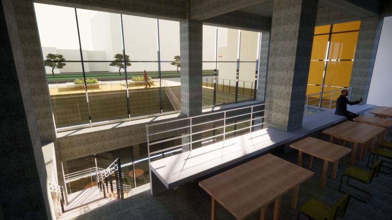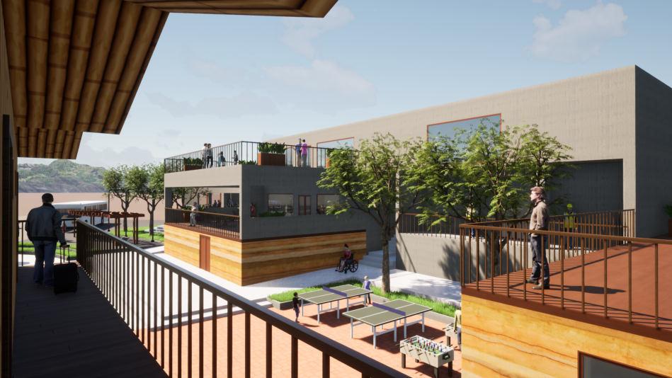 Vista del mobiliario urbanoVista de la conexión entre el área pública, de servicio y de hospedaje