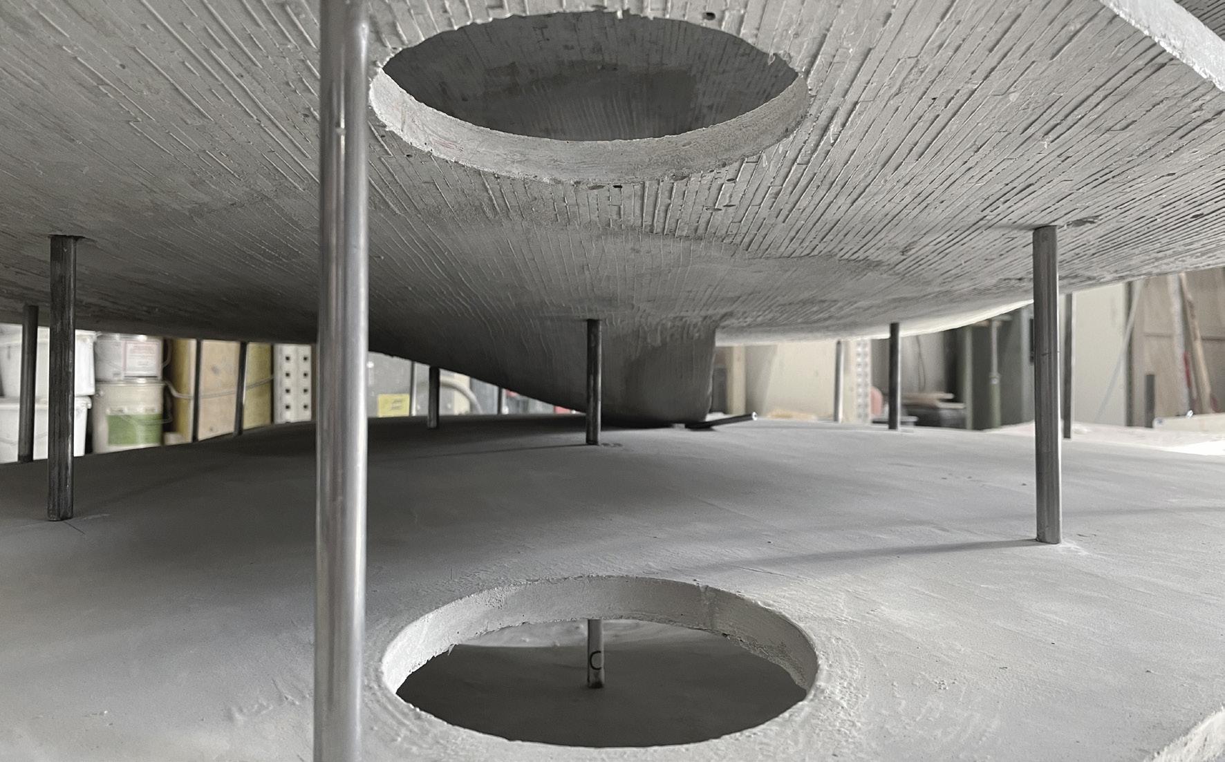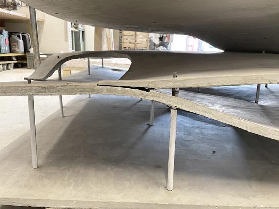The slabs bend and slop merging into each other creating ramps for cars and visitors but also responding to the horizontal loads. These continuous structures crate a ever-changing space and a constant change of spatial experience.
