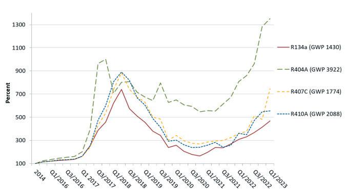 La Figura 1 mostra l’andamento dei prezzi di acquisto di quattro refrigeranti HFC ad alto GWP a livello di distributori di gas. I dati presentati comprendono i prezzi comunicati da tre grandi distributori di gas. I prezzi sono indicizzati all’anno di riferimento 2014 (= 100 %).