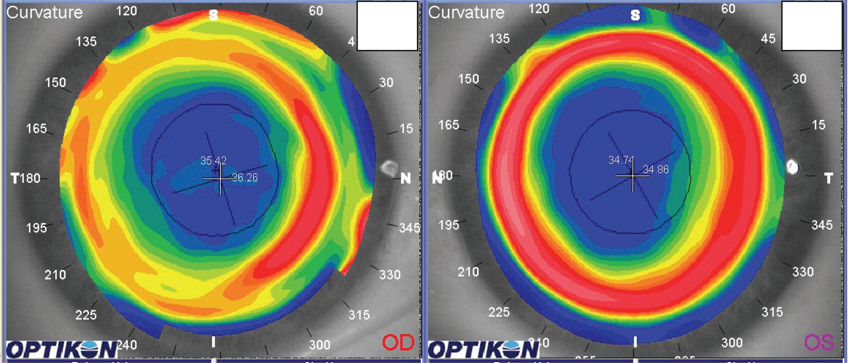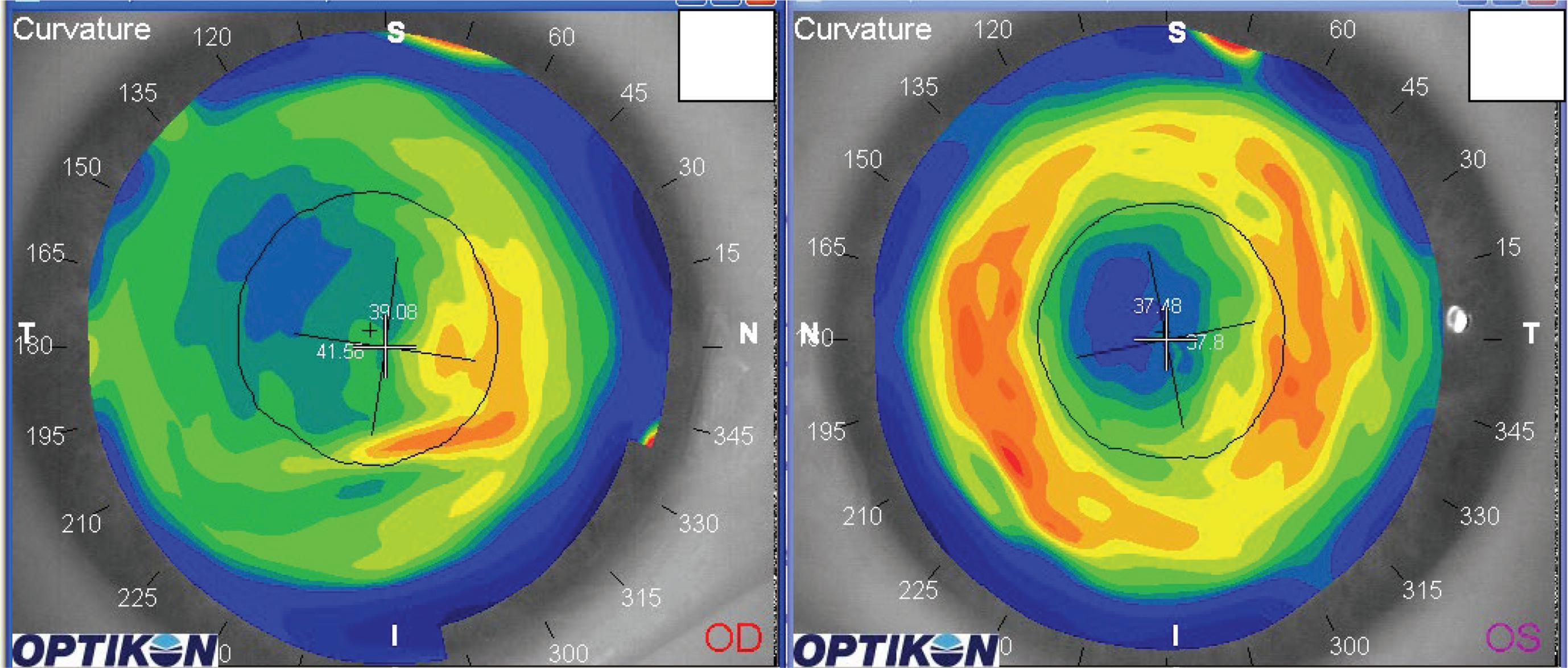 Questo è un esempio (figura 18-7) di zona ottica non omogenea, con decentramento dopo PRK in una miopia di media entità. Il decentramento del trattamento è infero-temporale in OO ed è evidenziabile dall’anello rosso non perfettamente concentrico alla pupilla. In questo caso abbiamo anche una zona ottica disomogenea (area blu non circolare) con una rilevante irregolarità evidenziata da una topografia “multicolore” nella zona supero temporale in entrambi gli occhi.