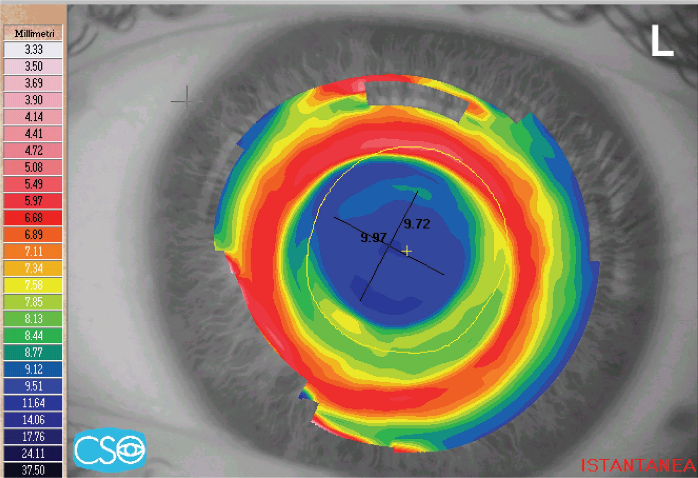 Eliminando l’astigmatismo ipermetropico +1.75 sf -2 cil a 80° 7/10, si passa ad una refrazione di +0.25 cil a 35° 8/10. La topografia tangenziale passa centralmente da colori freddi (blu) a colori più caldi (verde) a causa dell’incurvamento.