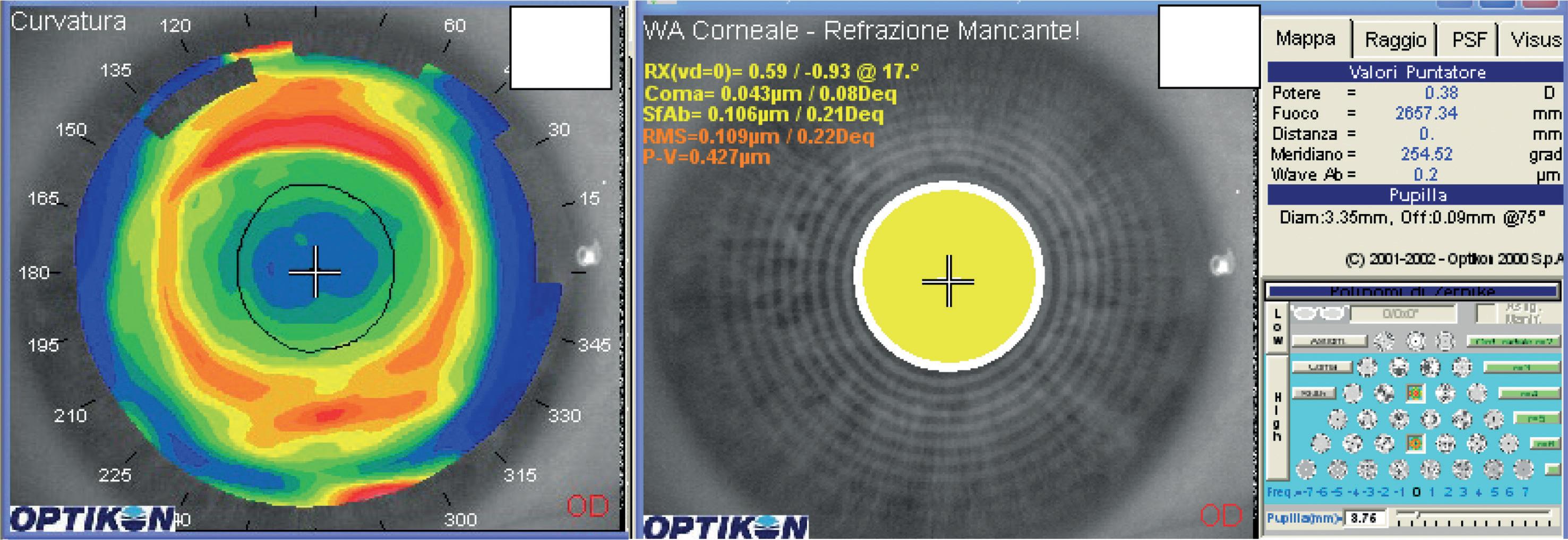 - La zona ottica può essere misurata grazie all’aberrazione sferica derivata dal wavefront corneale (verificare l’area in cui l’aberrazione è inferiore a circa 0.25 Deq, questa corrisponde alla zona ottica).