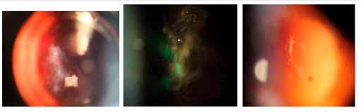 Vista dell’opacità vitreale (floaters) attraverso la lente Singh Mid Vitreous durante l’esecuzione della vitreolisi con laser YAG. Per gentile concessione del Dottor Inder Paul Singh.